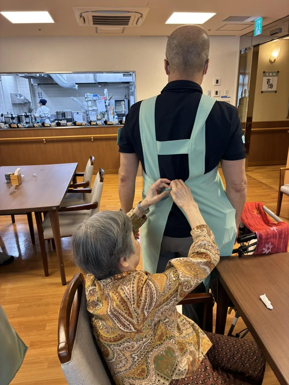 昼食時のレストランで、エプロンのボタンが留められず困っていたスタッフがいました。そのスタッフは背中に手が回らず、どうしても一人でボタンを留めるのは難しい状況でした。 そのとき、近くに居た女性のお客様がそっと、「手伝うわよ」と声をかけてくださいました。