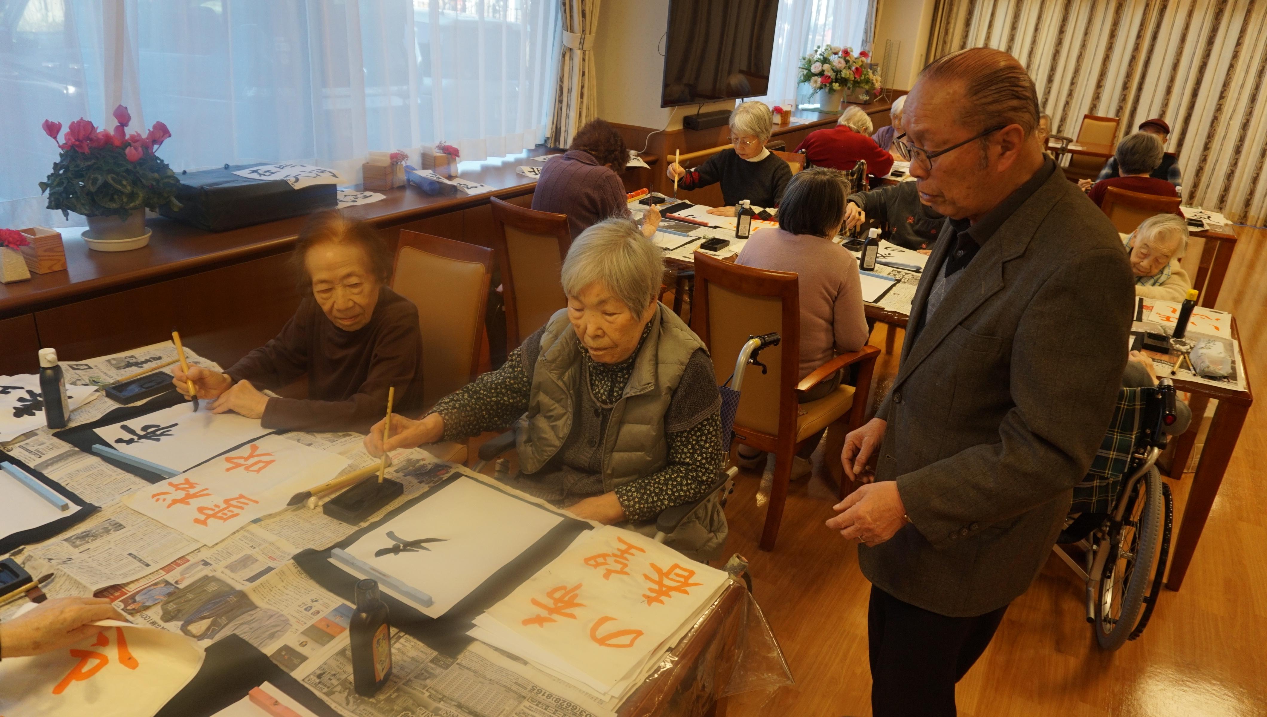 ツクイ・サンシャイン相模原では、毎月渡辺先生にお越しいただき書道教室を開催しています。先生のお手本をみながら、お客様が真剣に向き合われています。それにしましても、みなさま、達筆でいらっしゃいます!