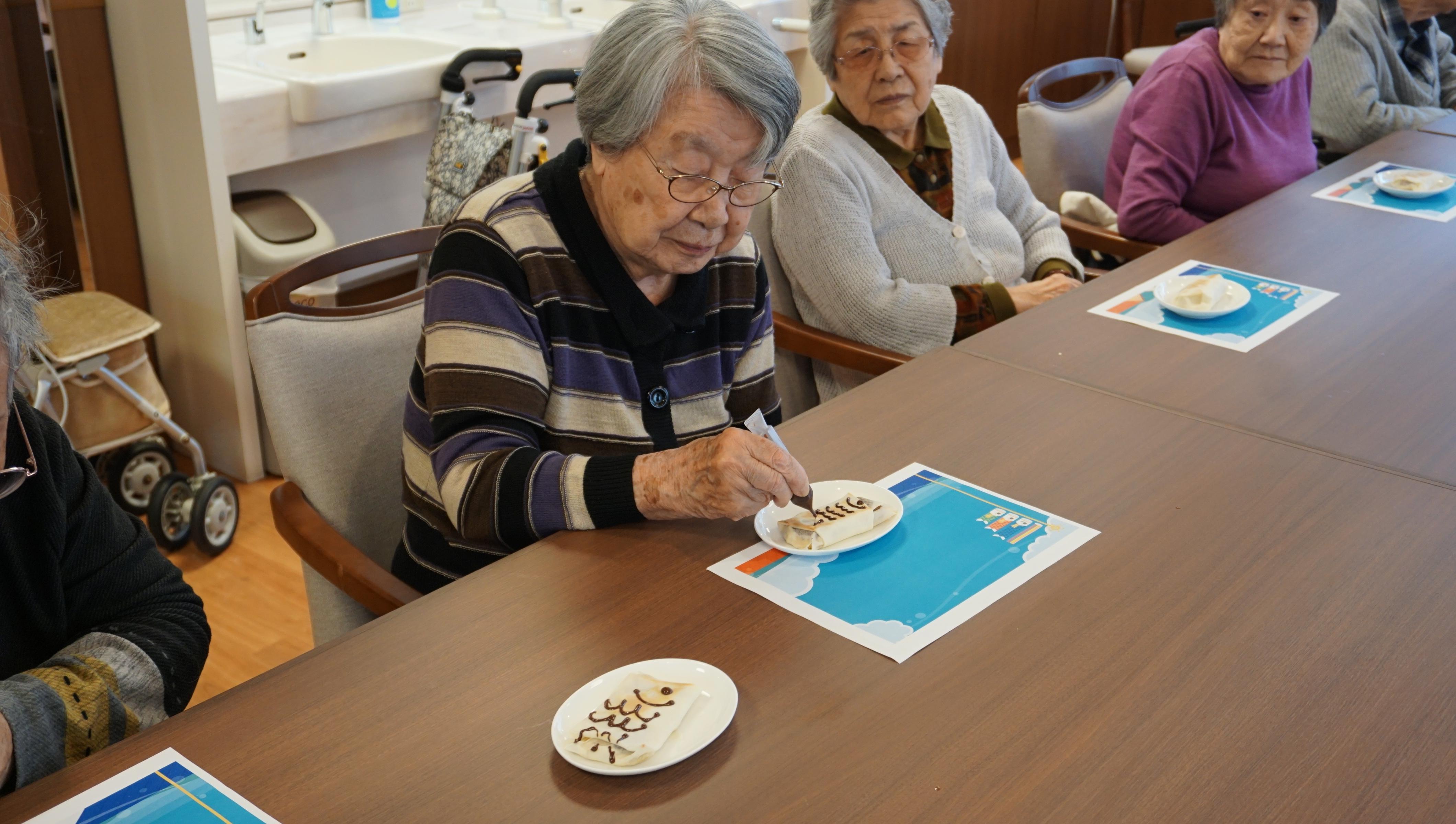 今月のおやつクラブでは、「鯉のぼりクレープ」を作りました。皆様可愛いクレープを作られて、「食べるのがかわいそう!」等声があがりました。