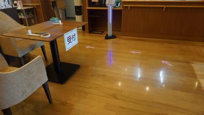 密にならないように受付町の椅子を配置し、動線がはっきりとわかるように床に矢印を貼りました。