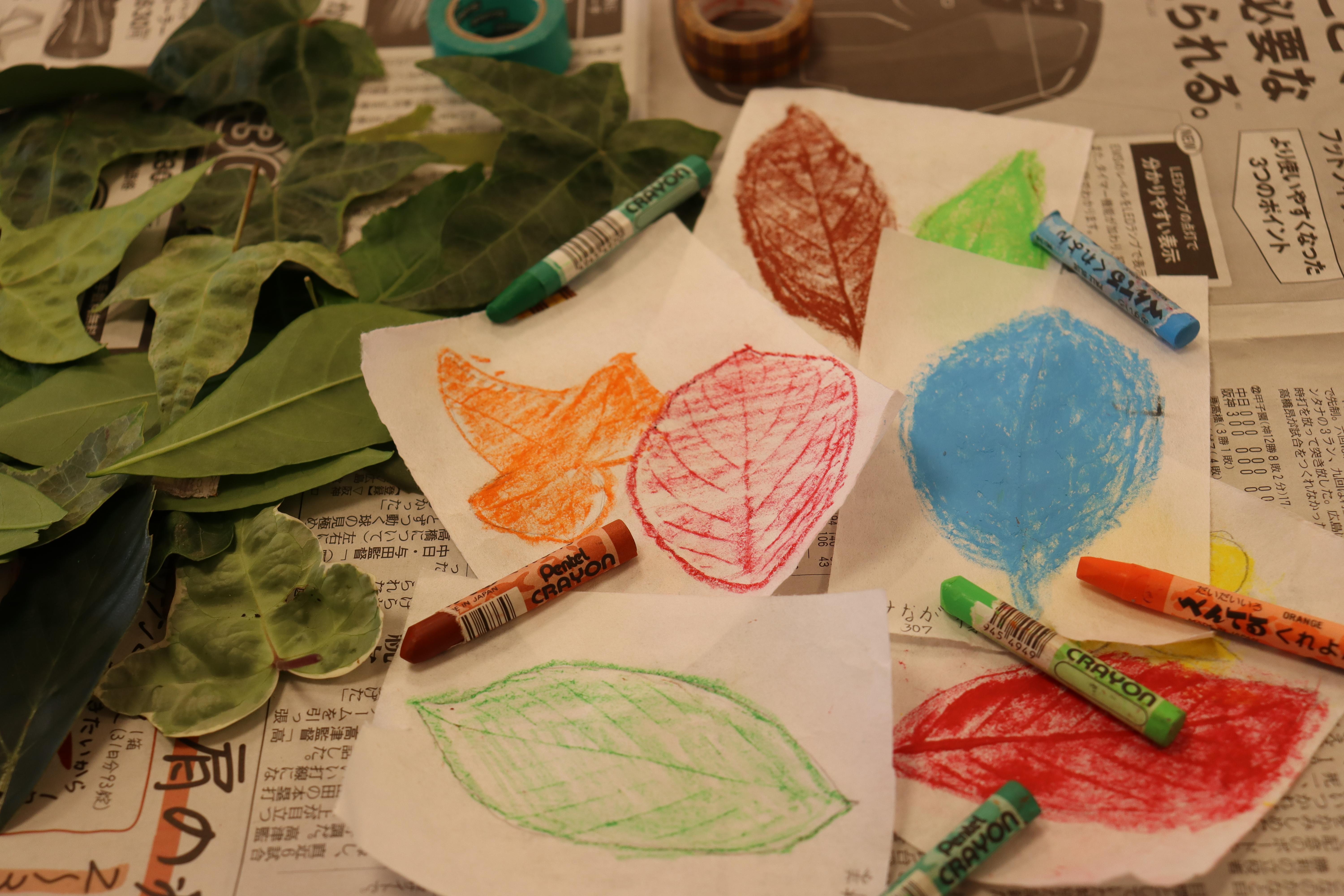 葉っぱの上に和紙を重ね、クレヨンで縁取り、カラフルな葉っぱの絵を作ります。