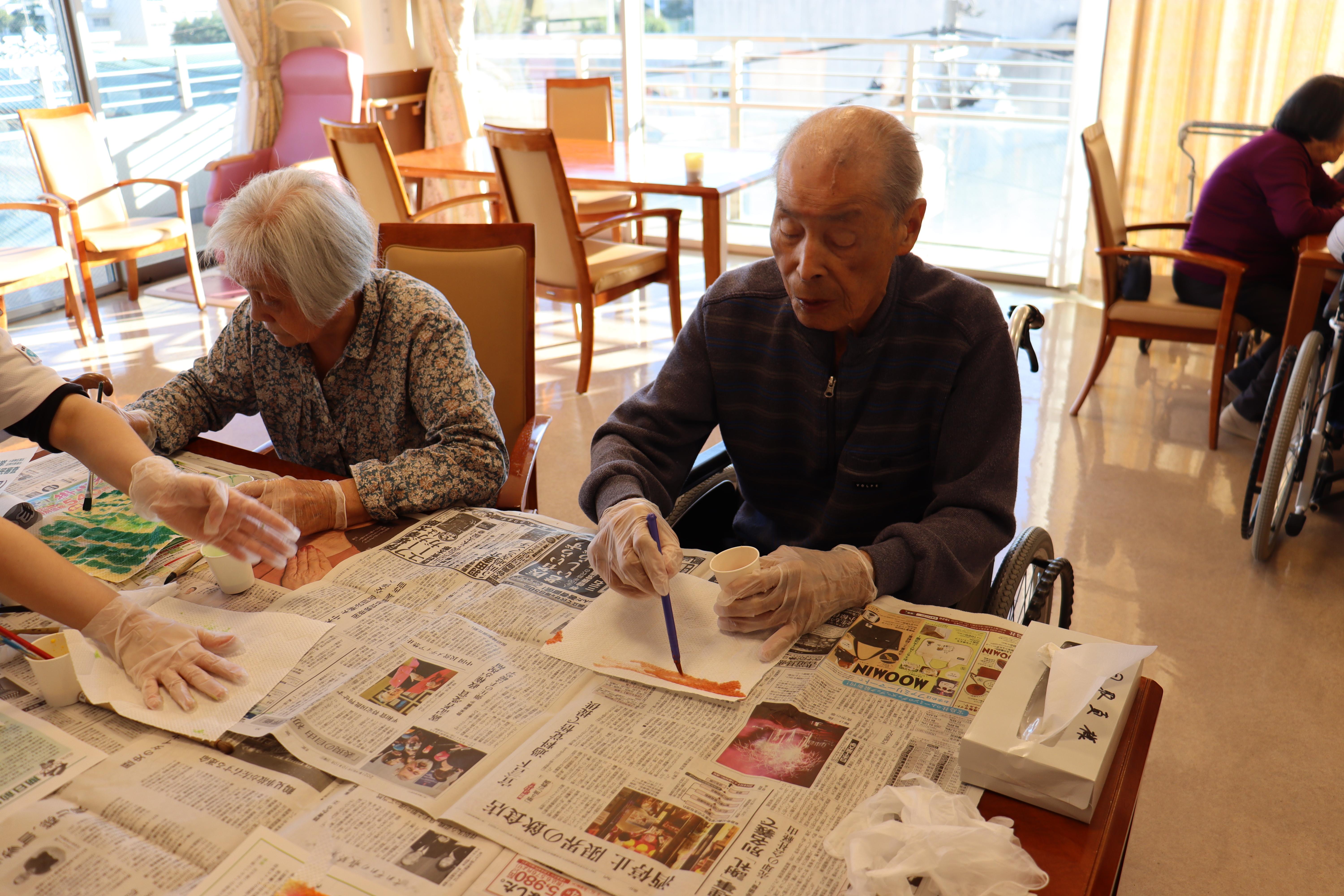 秋に向けた壁面飾りを各フロア進めております。なにか作業しているようです。