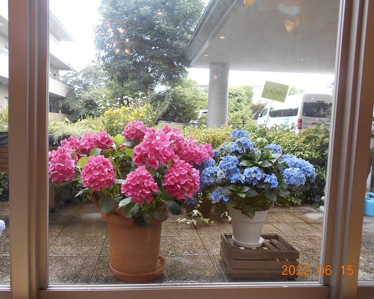 季節の花 紫陽花の大きな鉢をご用意しました。しっとりと雨に濡れた紫陽花は、一層その色が鮮やかに映ります。お客さまには、ロビーから窓越しに楽しんで頂いています。「ハワイアンピンク」という名の鮮やかなピンクの大鉢や、「レディーマタハリ」という花形の珍しい青い紫陽花など、最近は花のバリエーションも大変豊かになりましたね。