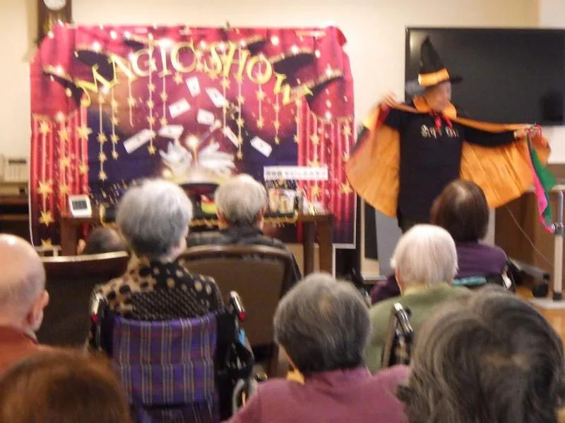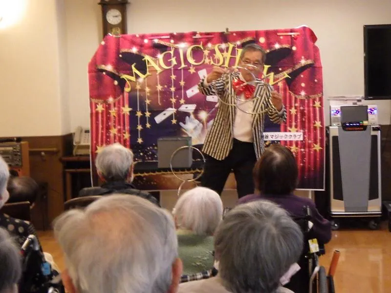 世田谷区特技ボランティアに登録されているマジックサークルの方々が楽しいマジックを披露して下さいました。南京玉すだれに始まり、リングやひもを使ったマジックなど!マジシャンの話術は巧みでぐんぐんお客様の心をつかんでゆきます!ハロウィンも近いので魔女に扮した女性が可愛くマジックを披露してくださりお客様に大人気でした。「お客様が飽きず熱心にマジックを見て下さったのがとても嬉しかったです」とマジシャンの方々もとても喜ばれていました。