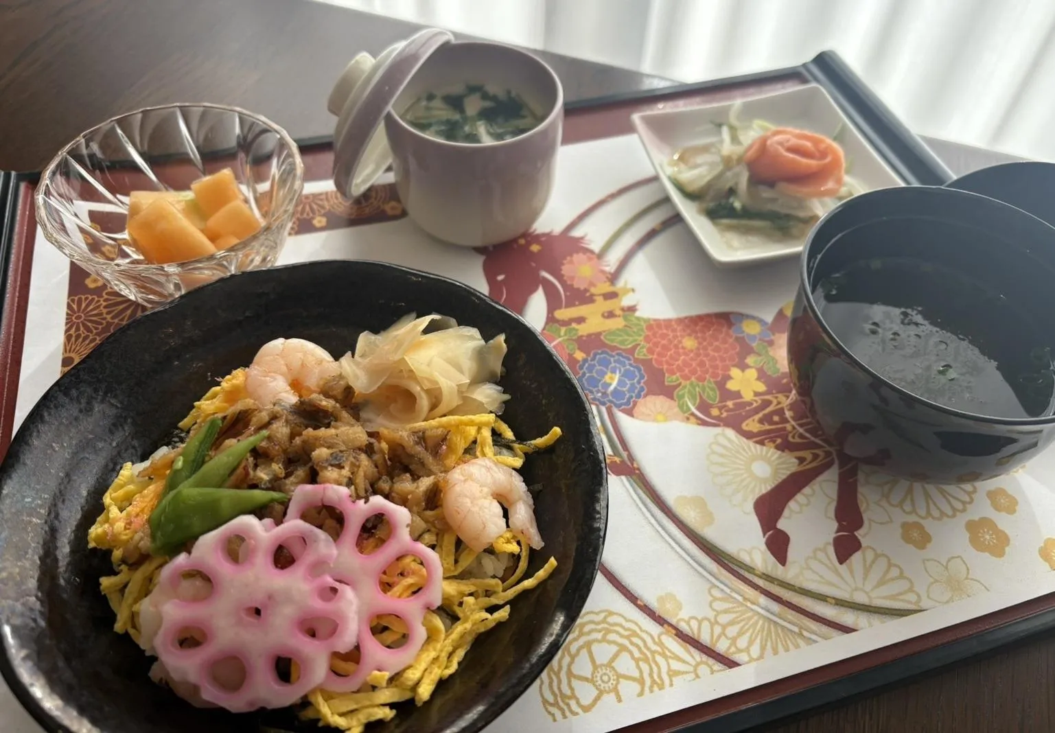 ご昼食は五目ちらし寿司、茶わん蒸し、スモークサーモンサラダとお吸い物。