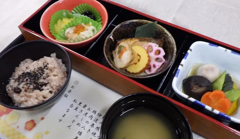 お正月らしく彩りよく縁起の良いおかずを取り合わせたお食事を楽しんでいただきました。