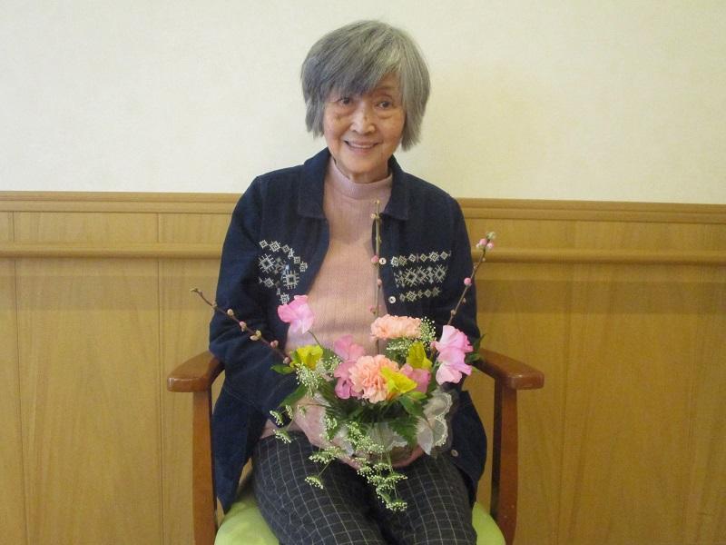今月の生け花クラブも、感染対策のため密を避け・・・少し寂しいですがフロアごとの開催でした。もう少しで春ですよ~春ですね~早く外出できる日が来ますように・・・願いを込めて、アレンジに集中!メインは桃?梅?でしょうか