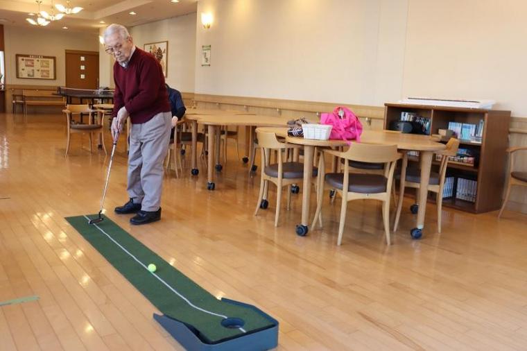 普段の移動は車いすや歩行器を使って移動するお客様も機能訓練を活かし、ご自分の力でカップインを目指します。