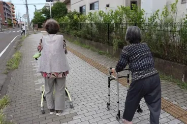 「デコボコだから気を付けないとね」「ここ斜めっているから、こっち歩いた方がいいわね」