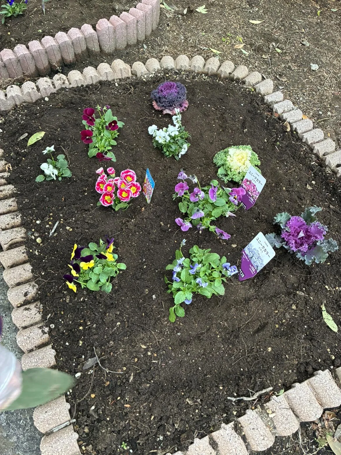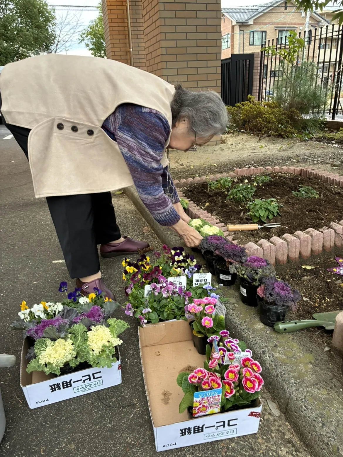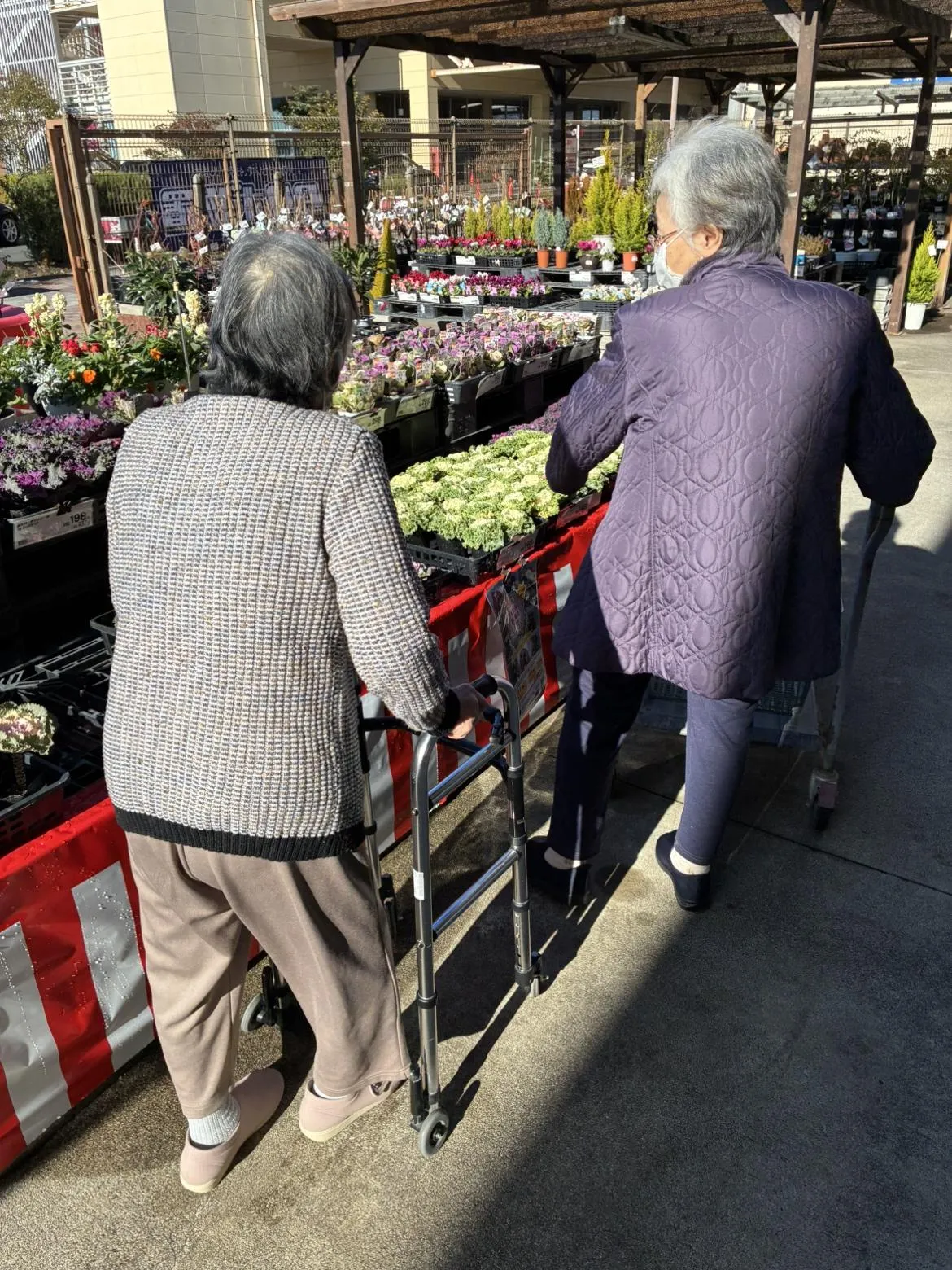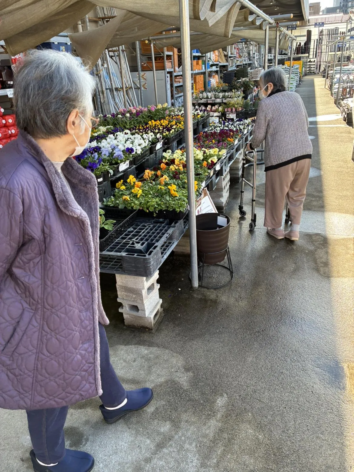 施設の花壇で暑さ寒さに頑張ってくれた花たちが勇退するので、お客様と一緒に近所のホームセンターで植える花を購入。