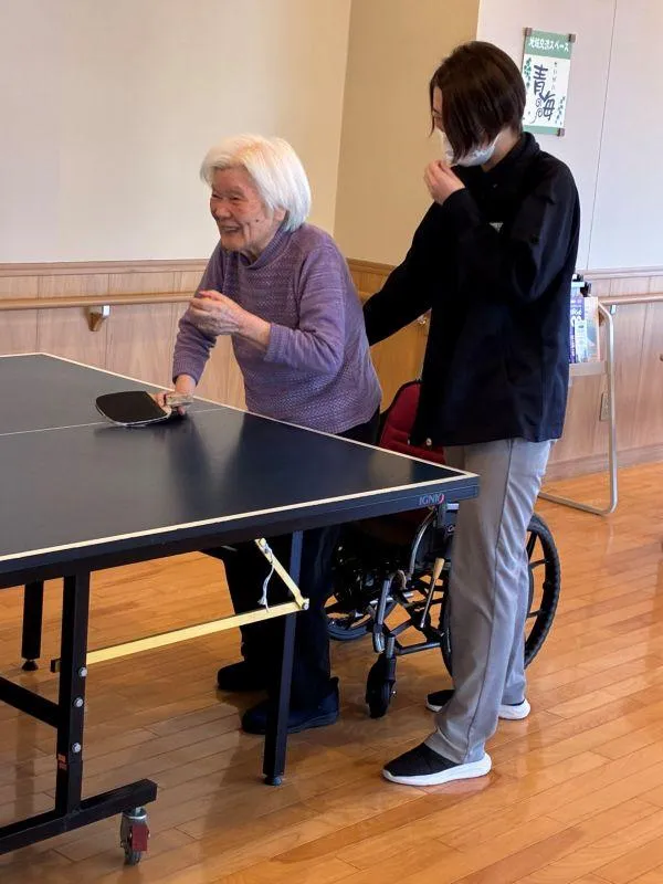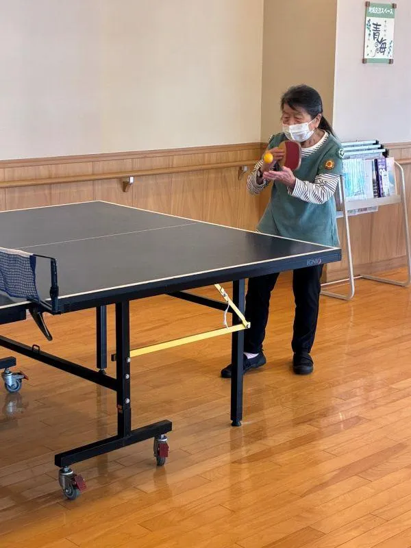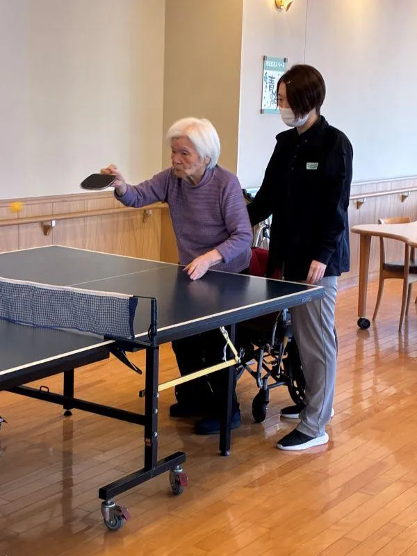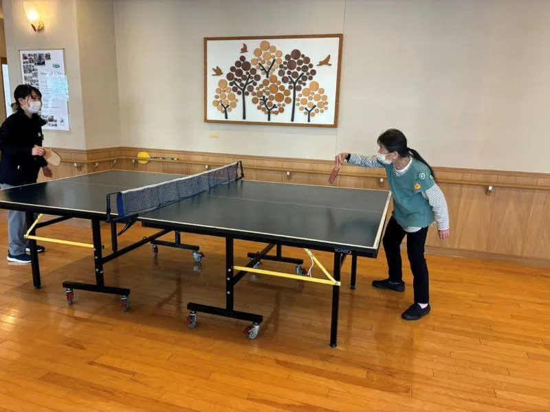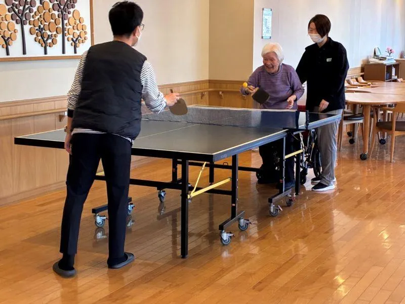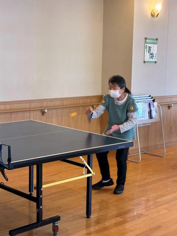 施設エントランスに〝どーんと構える卓球台〟卓球療法とまではいきませんが皆様、ストレス解消や気分転換、リフレッシュにと楽しまれています。