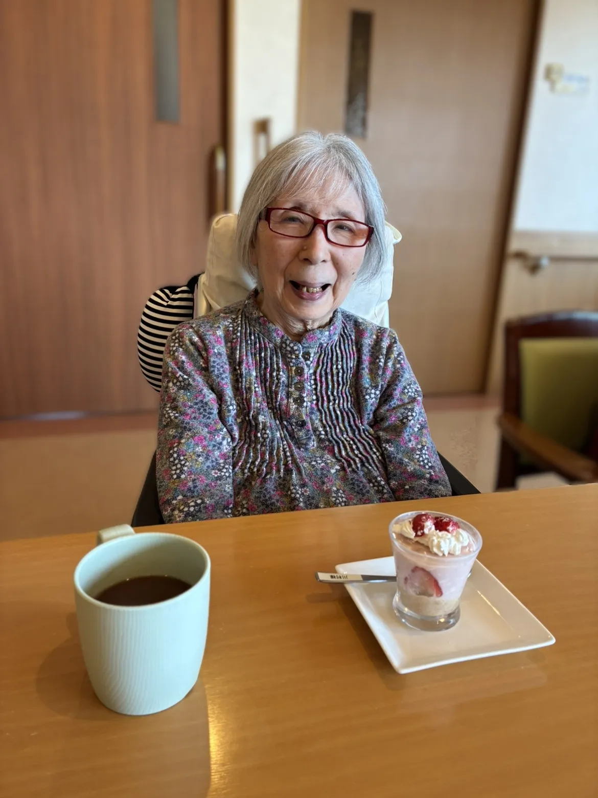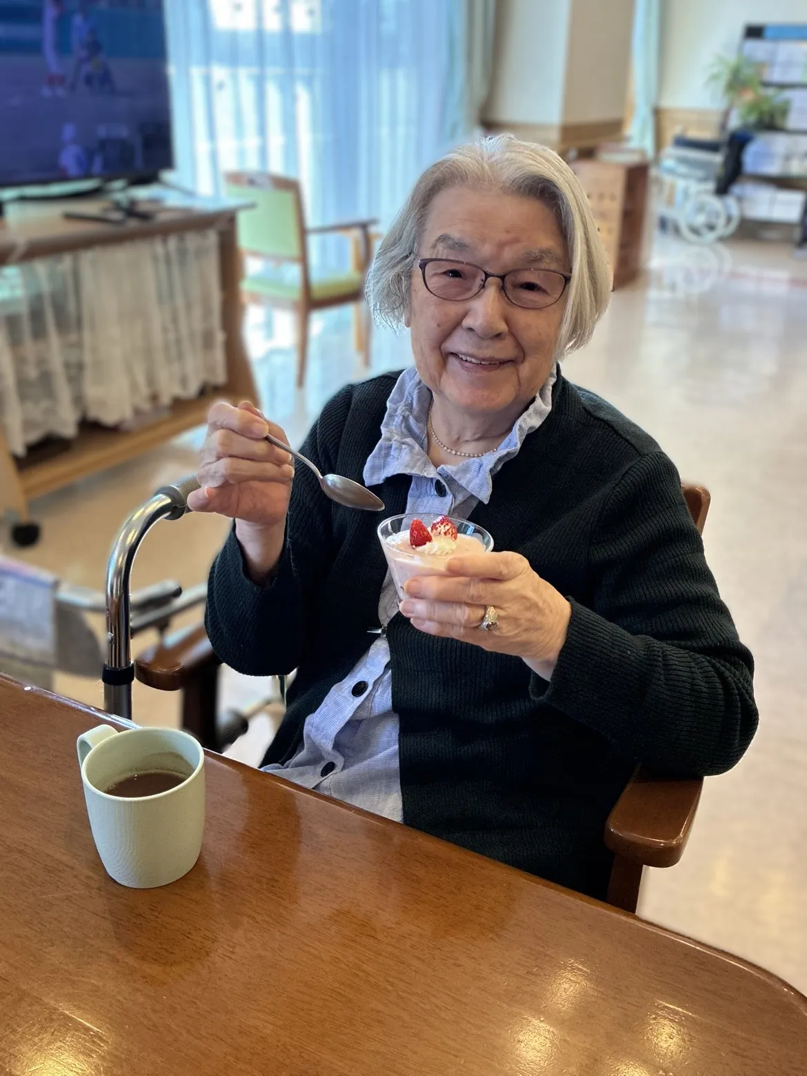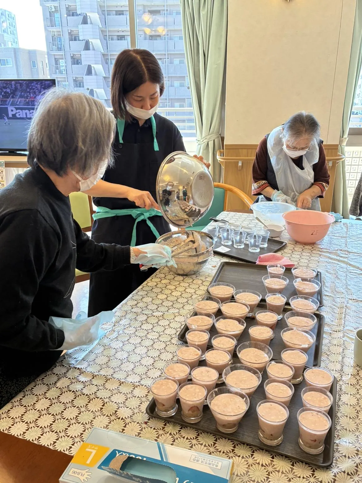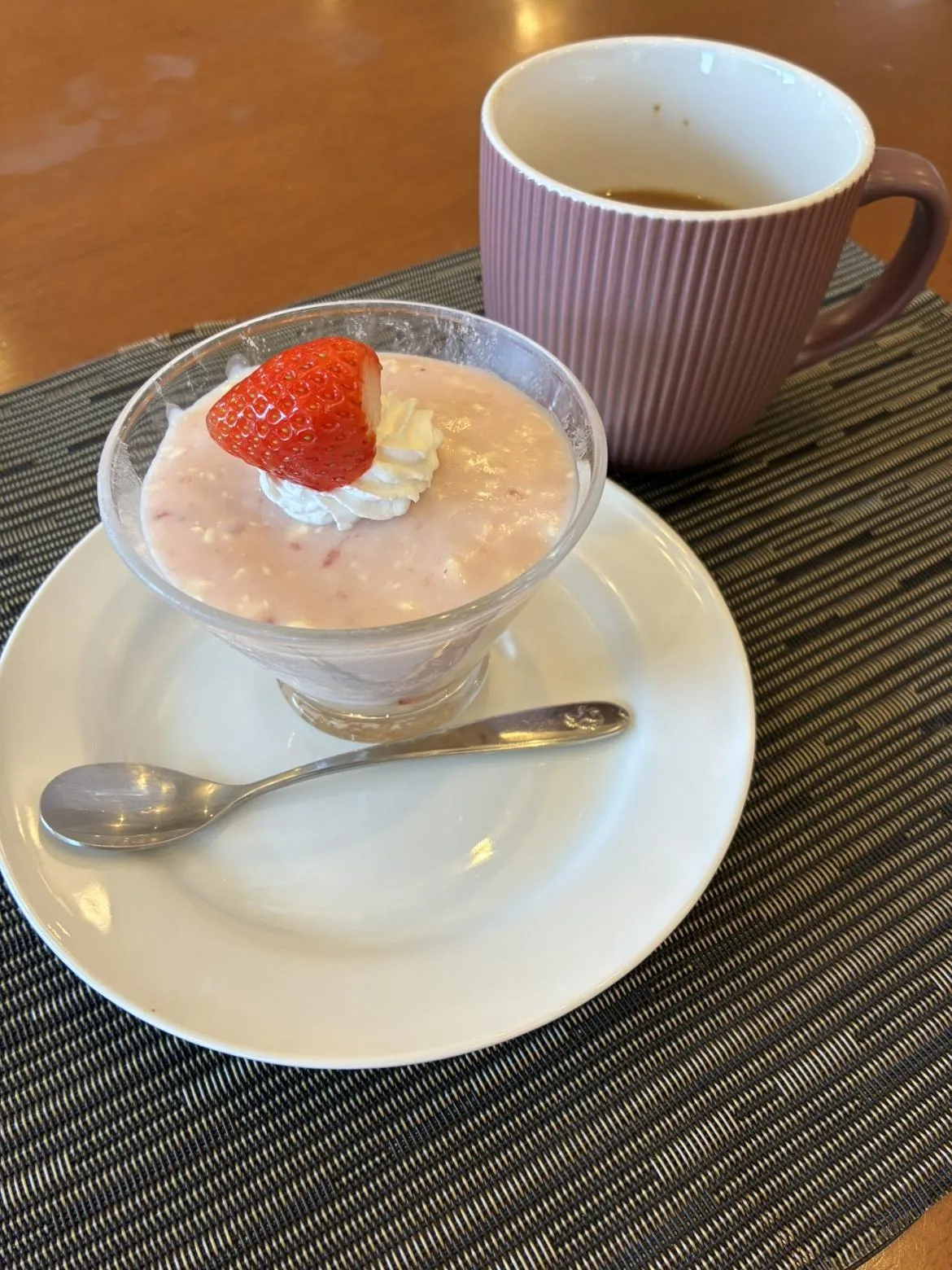 完成した苺レアチーズケーキ。「イチゴが甘酸っぱいけどチーズとよく合って、お店に出してもいいわよ!」と絶賛。私も味見をしてみたかったです。