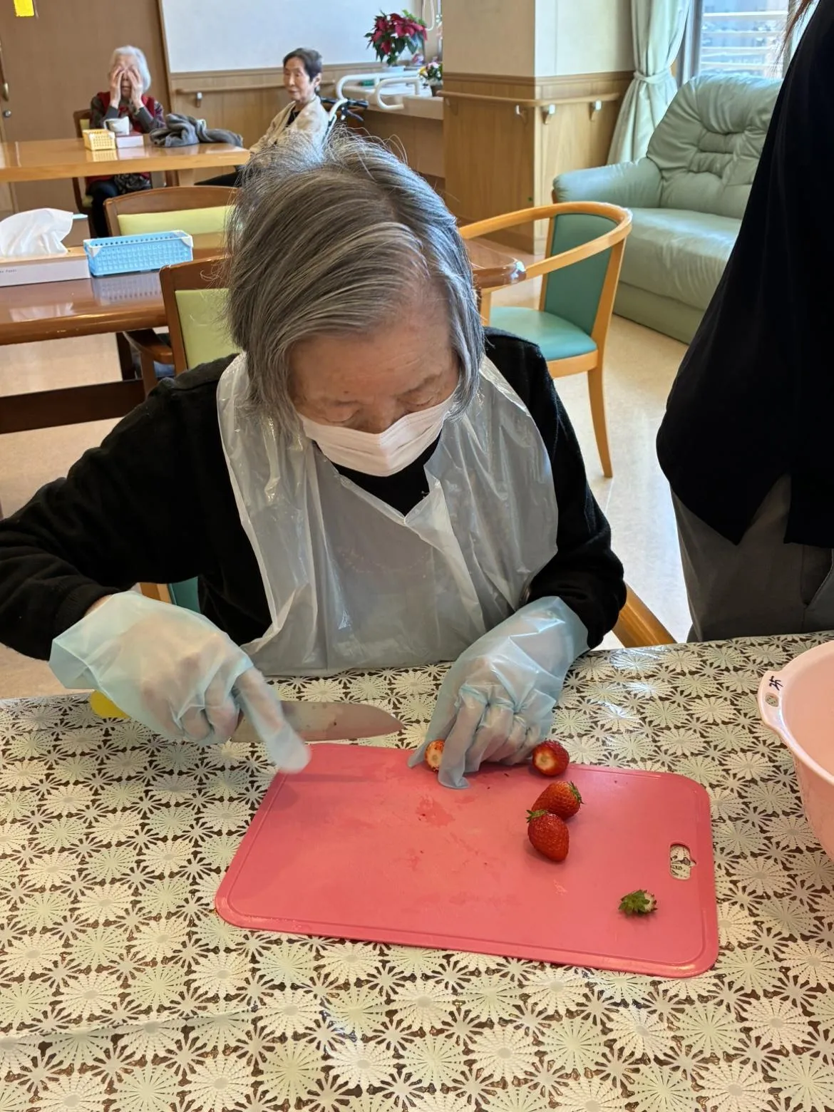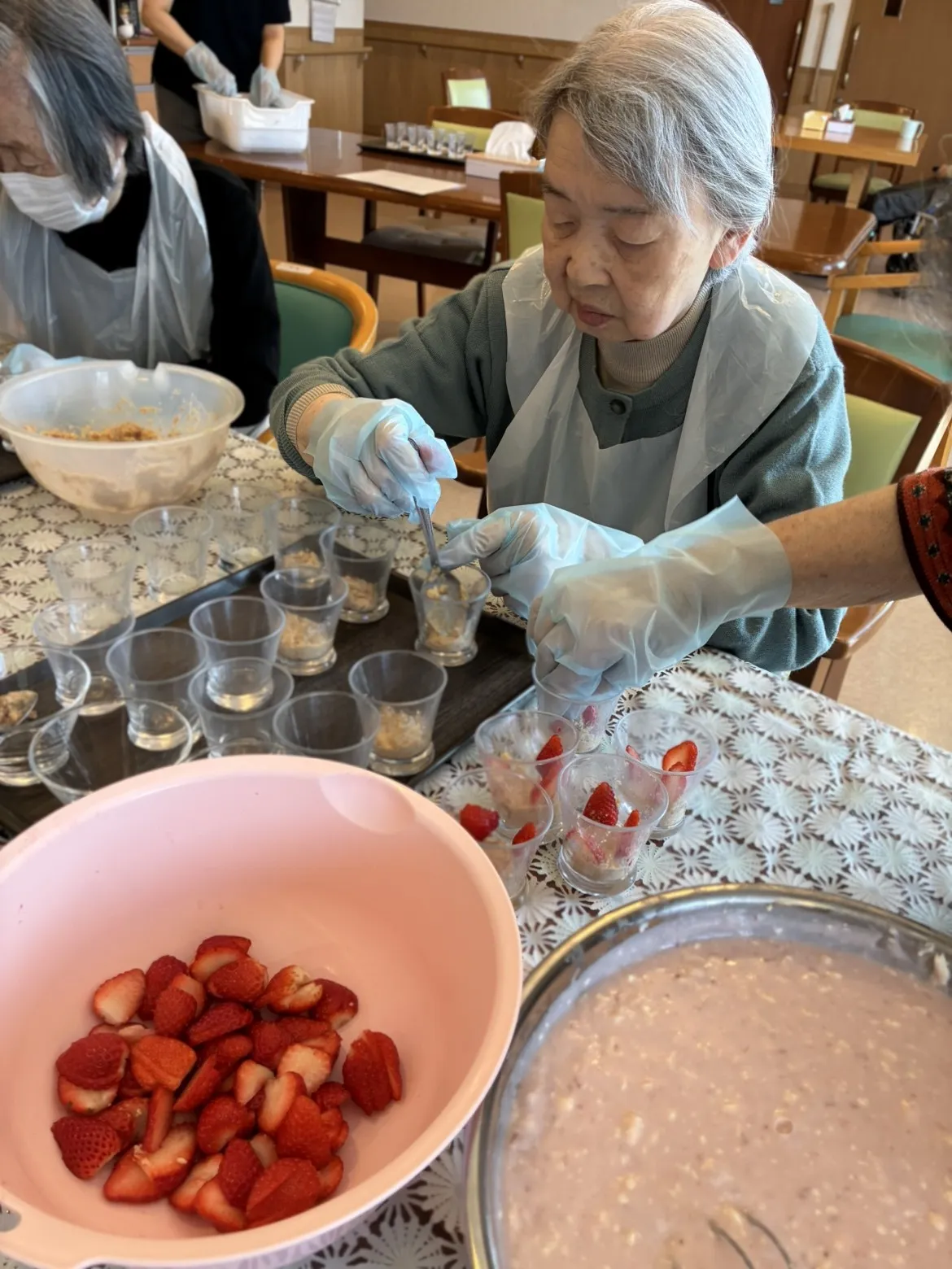 苺は喧嘩にならないよう(笑)、均等に切ってクリームと盛り付けしていきます。フロアには苺のよい香りが広がっていました。