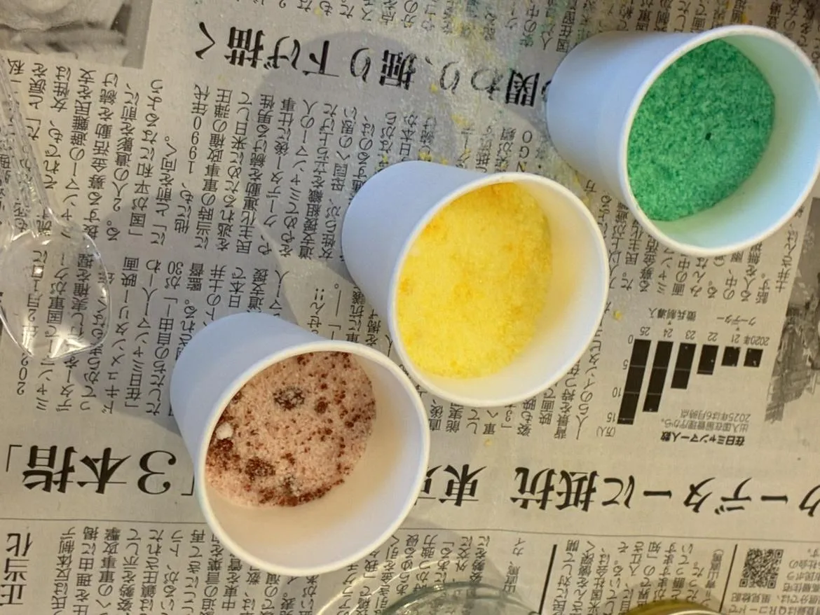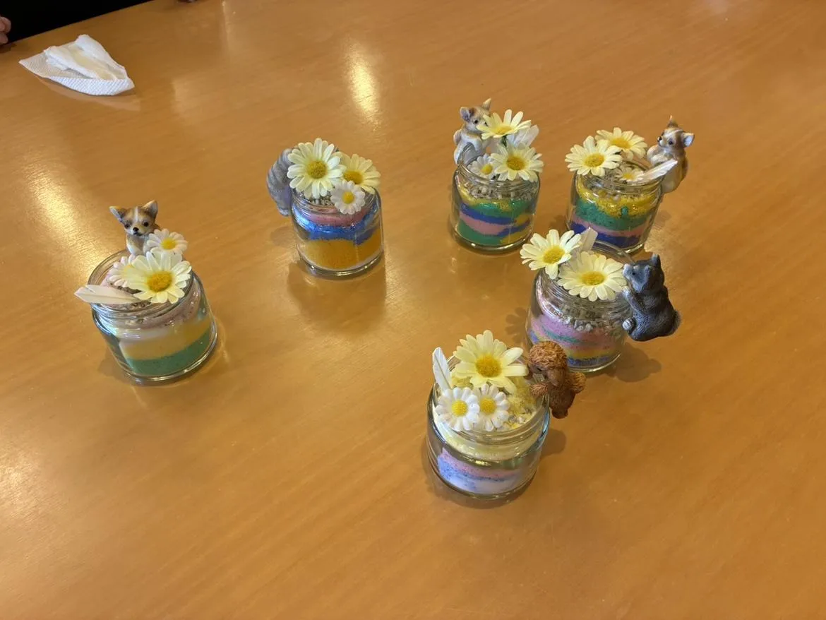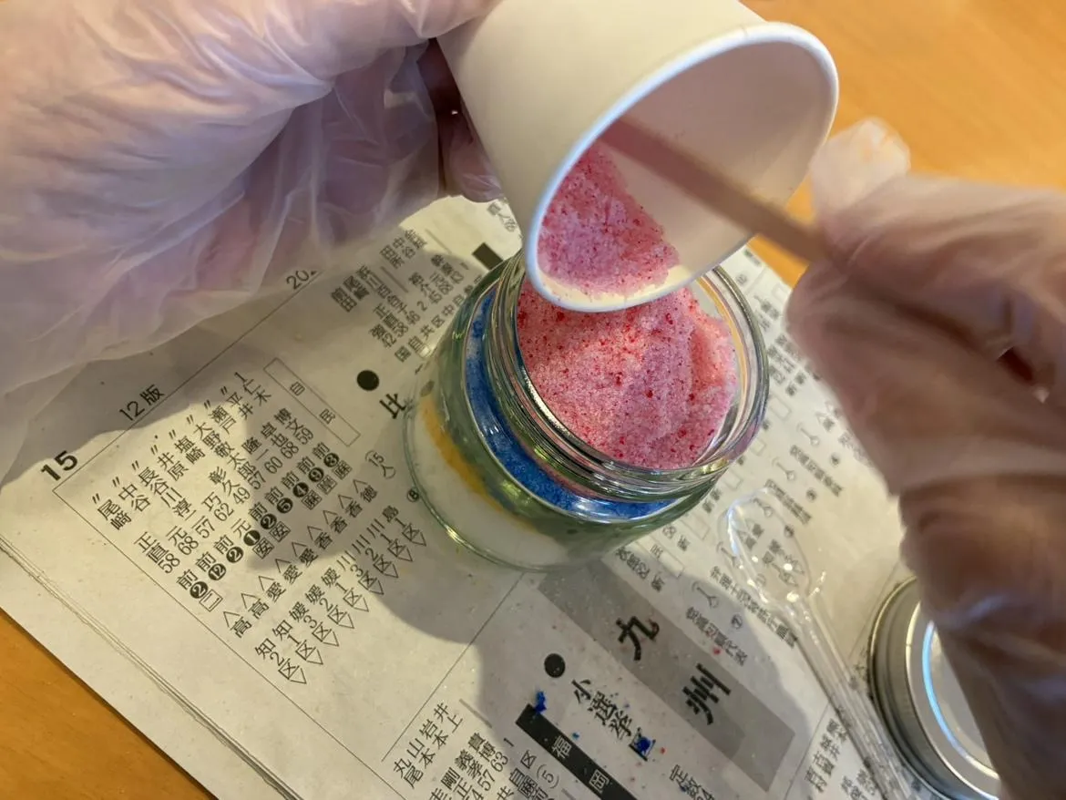 塩に絵の具を吸わせて色付けしたものを容器に流し込み、飾りをつけて完成!