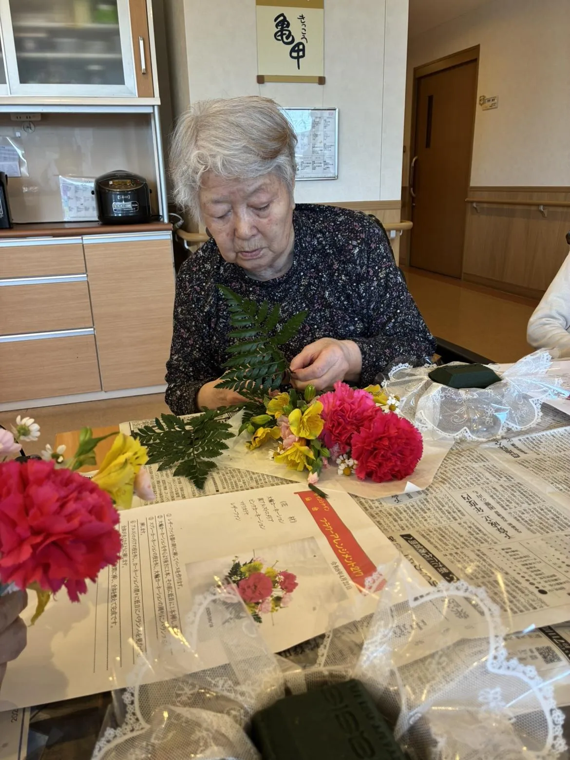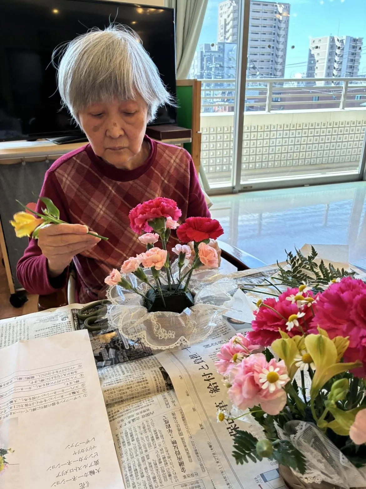 今回は春らしいピンクや赤のカーネーションをメインに、黄色のアルストロメリアとマトリカリヤで飾り付けていきました。