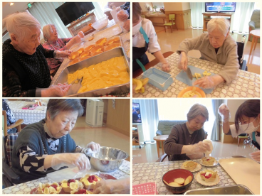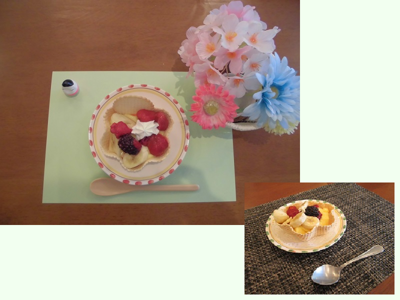 いろいろな会話も弾みながら、可愛らしいワッフルボウルにプリンを盛り付けたら、果物と甘~いホイップをトッピング!