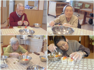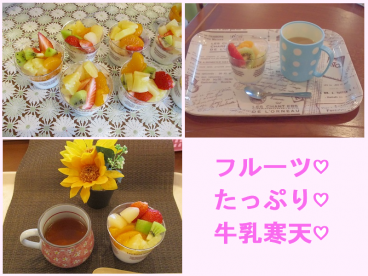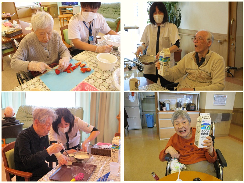 大好きなフルーツと牛乳を使って、おやつ作りレクリエーション開催です。