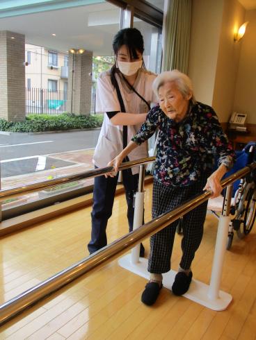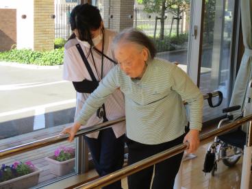 なかでも【平行棒】では、歩行練習や段差昇降の練習など、お客様おひとりおひとりの状態や目的に応じて、さまざまな訓練に取り組んでいます。
