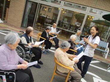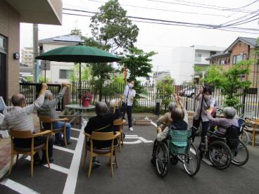 今日はとても暖かく穏やかな陽気だったので、グループ体操を施設のお庭で行いました!