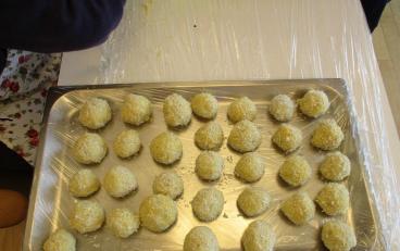潰したジャガイモと先ほどシェフが炒めた玉ねぎ、挽肉がボールの中で出会い、混ぜられています。どうやらこれから丸められる様子…