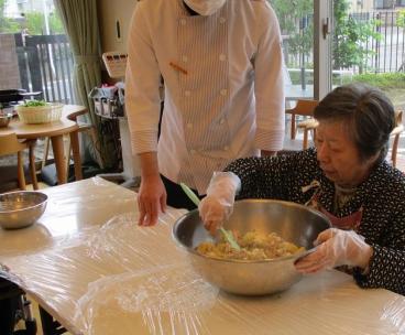 野菜を切る、炒める、混ぜる、丸めるなど、高度な調理作業も行うツクイ・サンシャイン仙台の料理クラブでした。