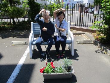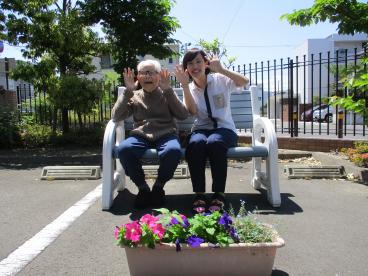 正面玄関の近くで育てている花や、近くを通る子供たちを見ながら日光浴をしました。