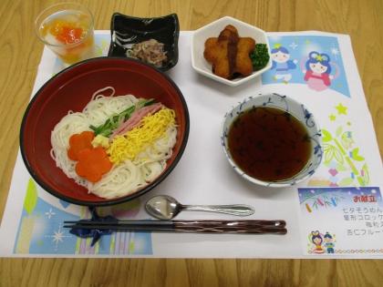 メインは天の川をイメージしたそうめん、お星さまコロッケ、もやしの梅和え、お星さま型の杏仁豆腐です。