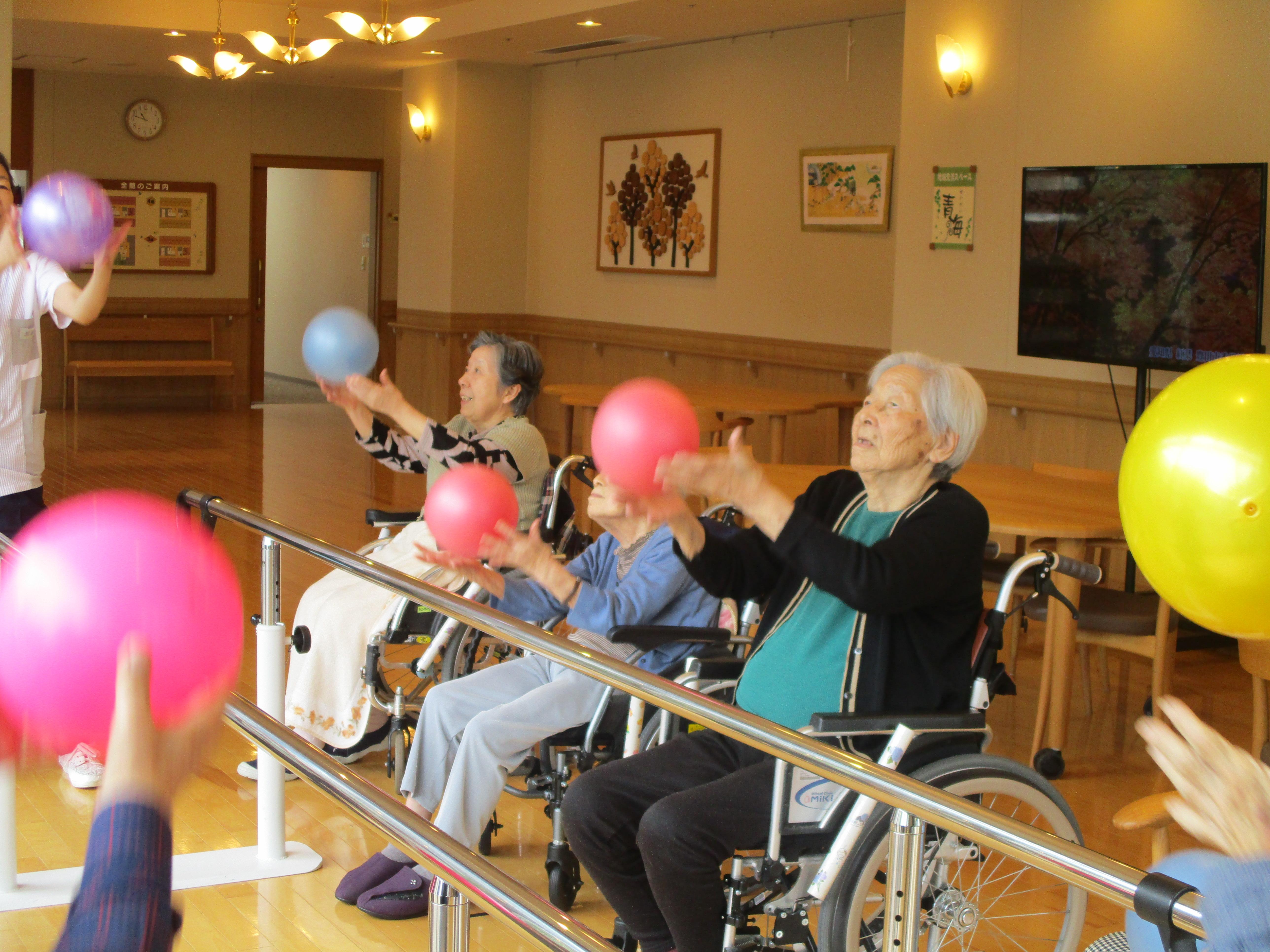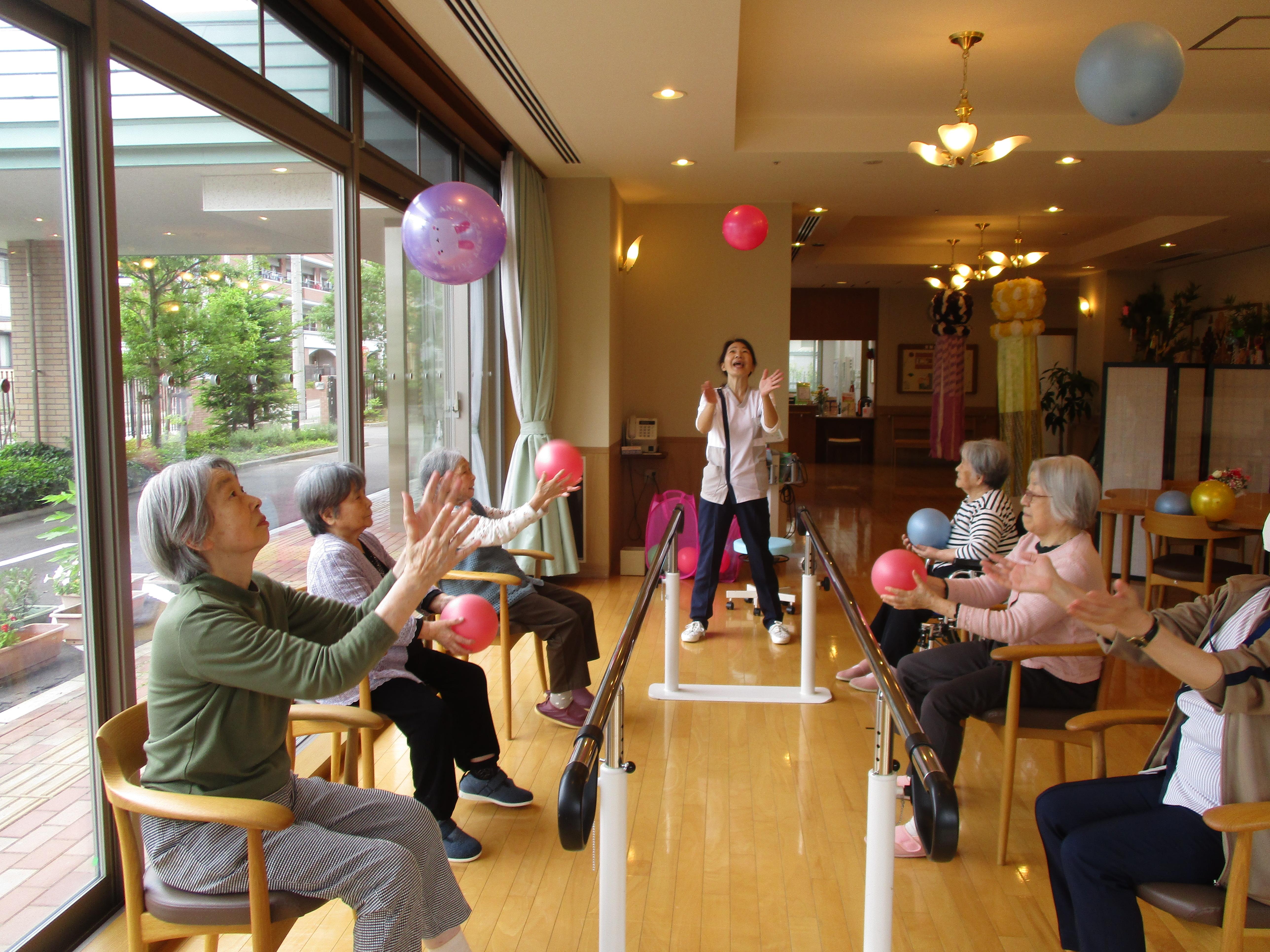 雨の日が続いておりますが、皆様、屋内で日々機能訓練に励んでいます!!