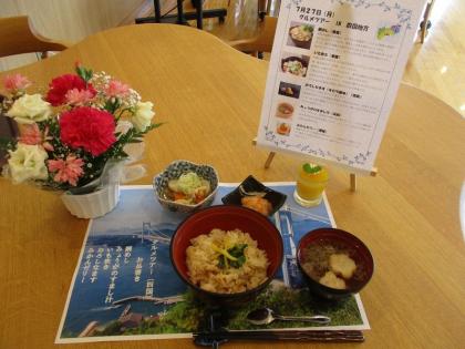 メニューは、鯛めし・芋炊き・おろしなます(すだち風味)・みょうがのすまし汁・みかんゼリーでした。