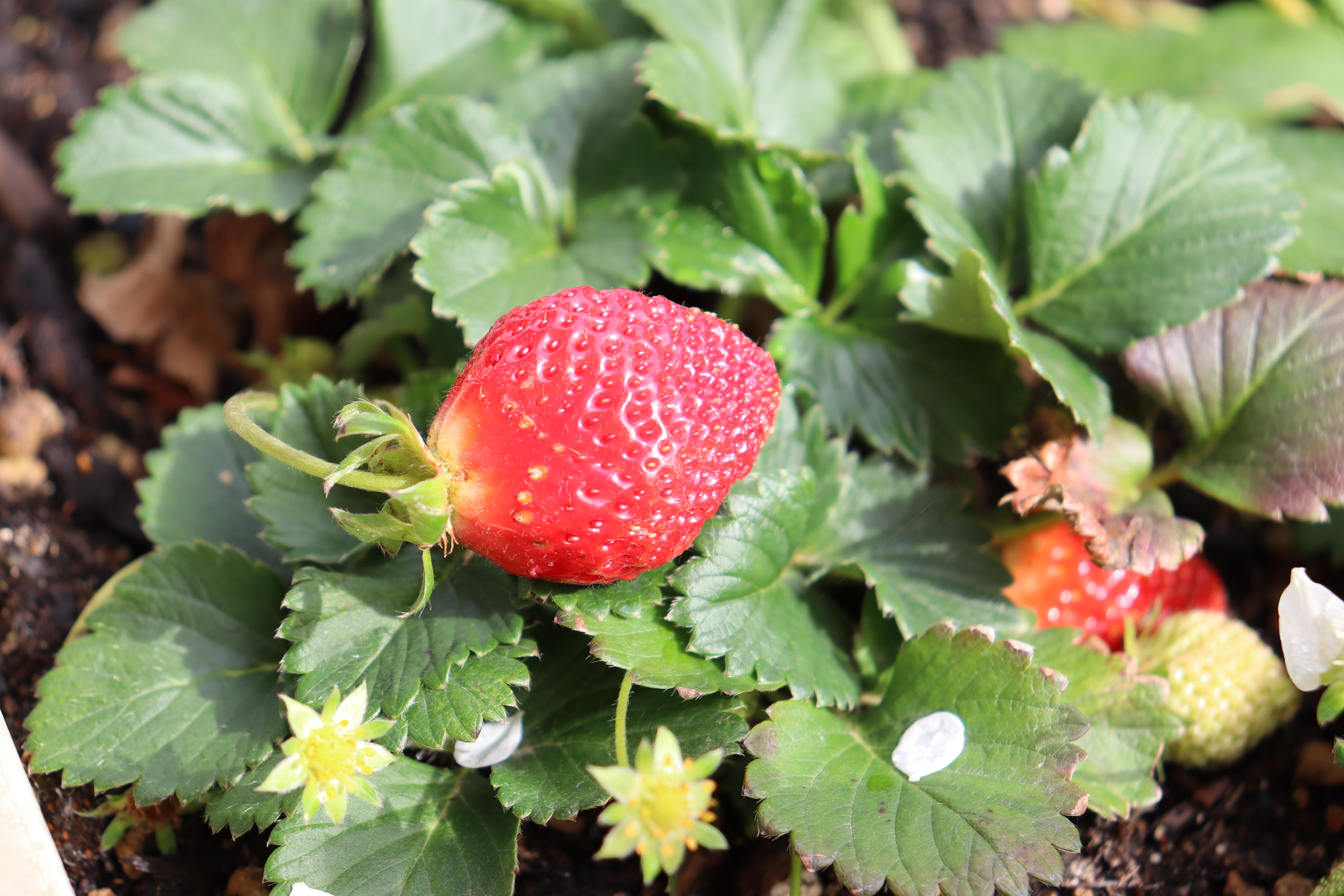 苗から育てたイチゴが少しずつ色づいています。今年初めて収穫を行いました。次は夏野菜を育てます!