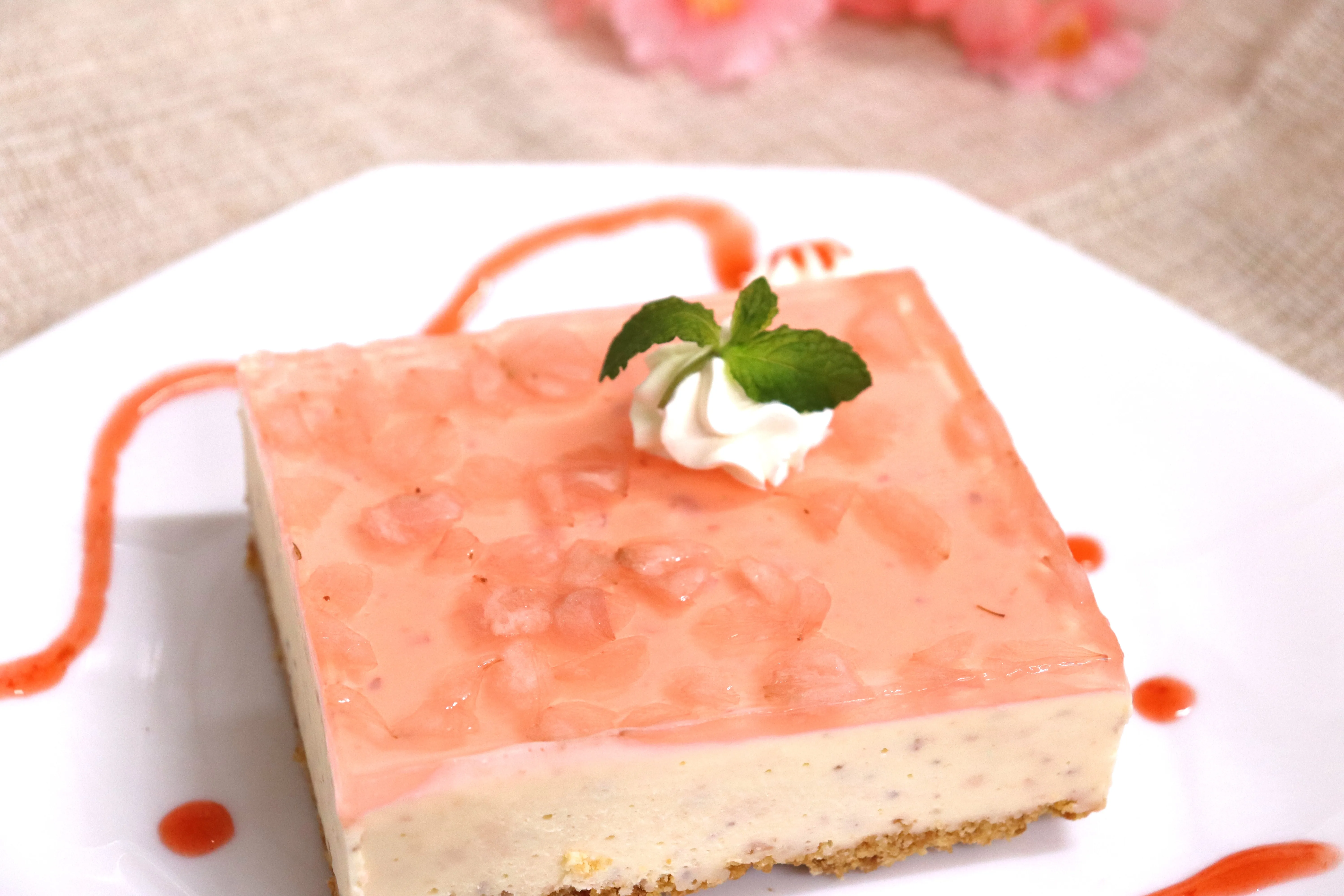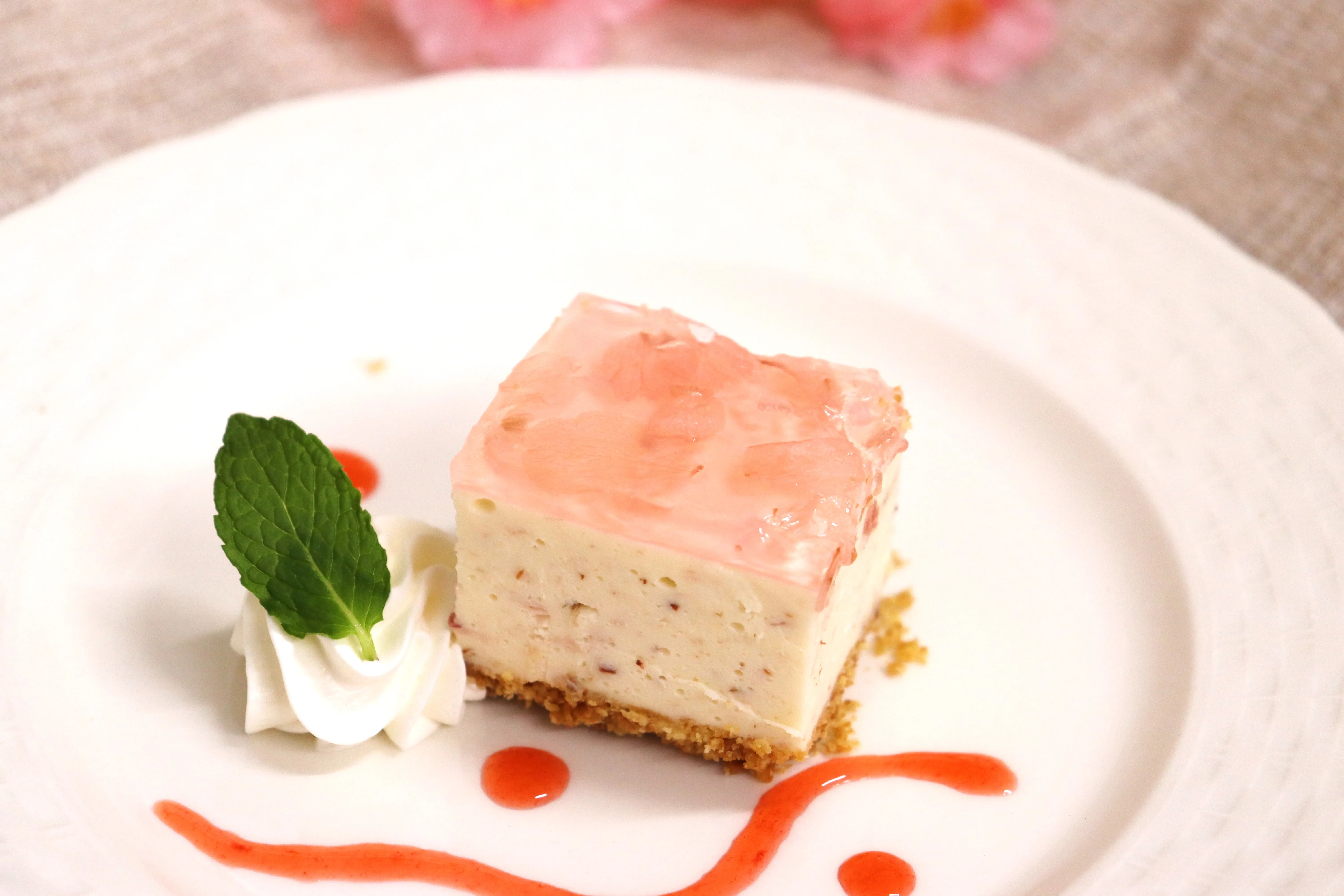 桜をイメージしたレアチーズケーキです。甘さの中にほどよい酸味があり、皆さんがさっぱりと食べやすい食感です。
