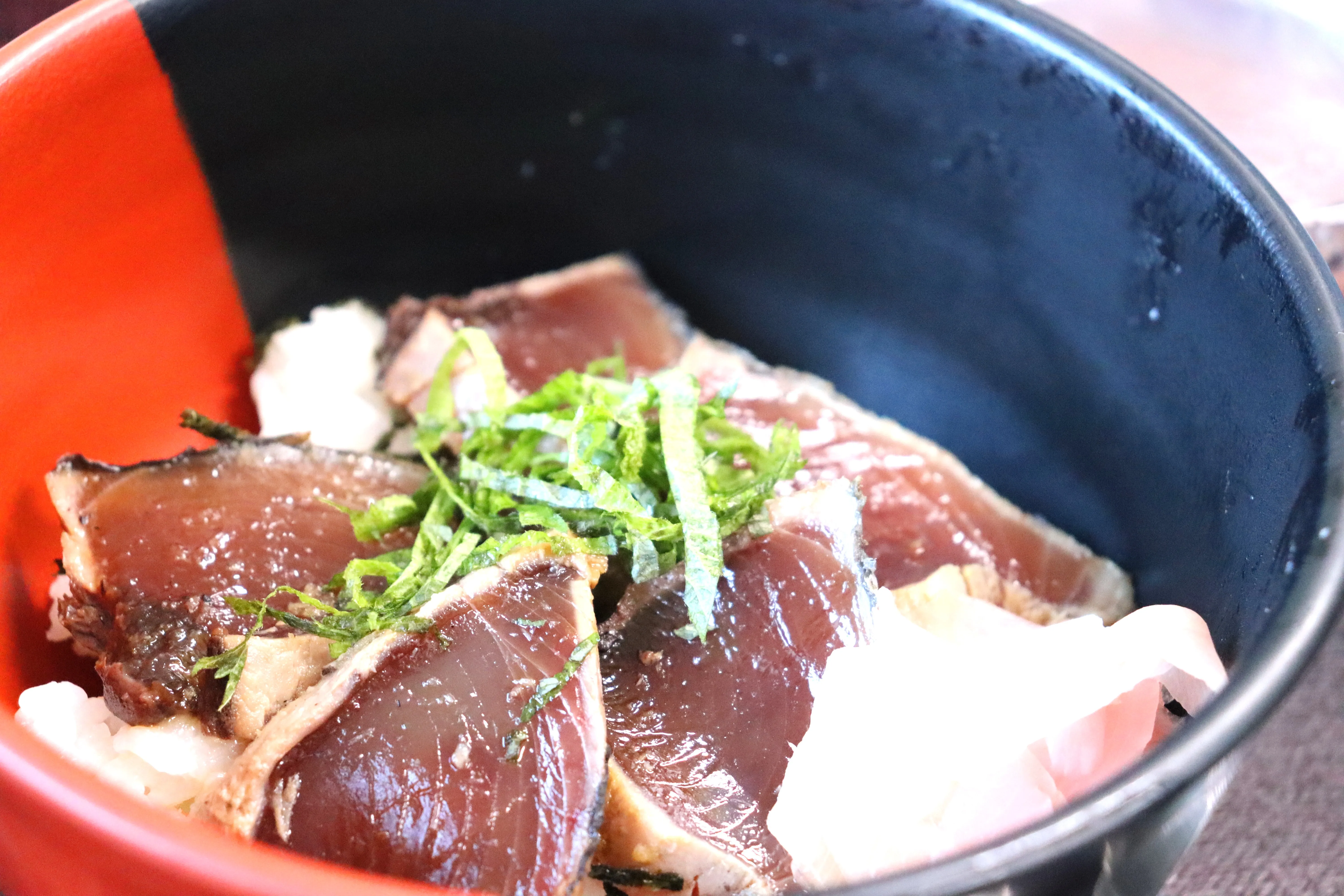 カツオのたたきの海鮮丼です。薬味には、しそを添えており、さわやかな香りが後味をスッキリとさせます。