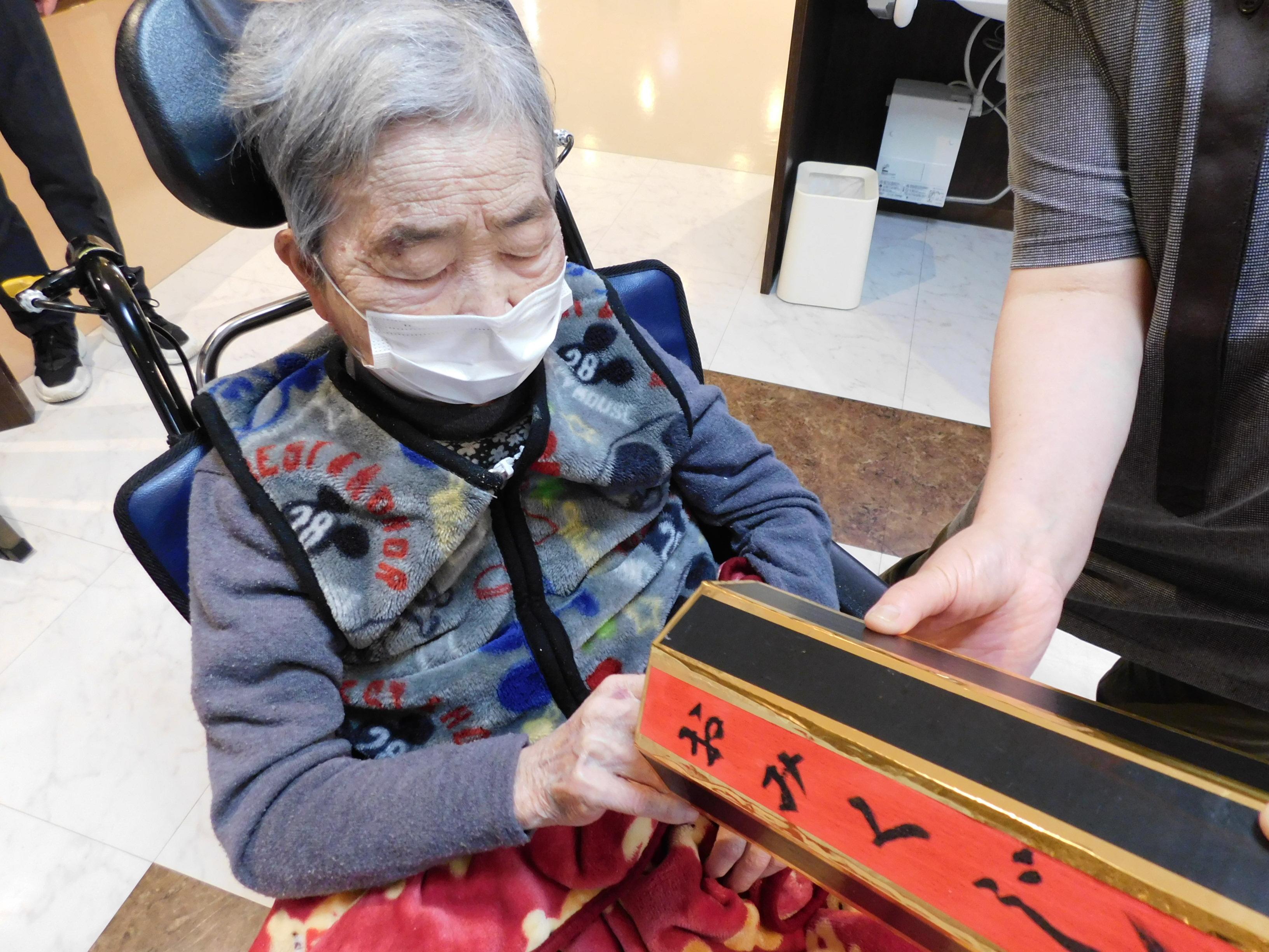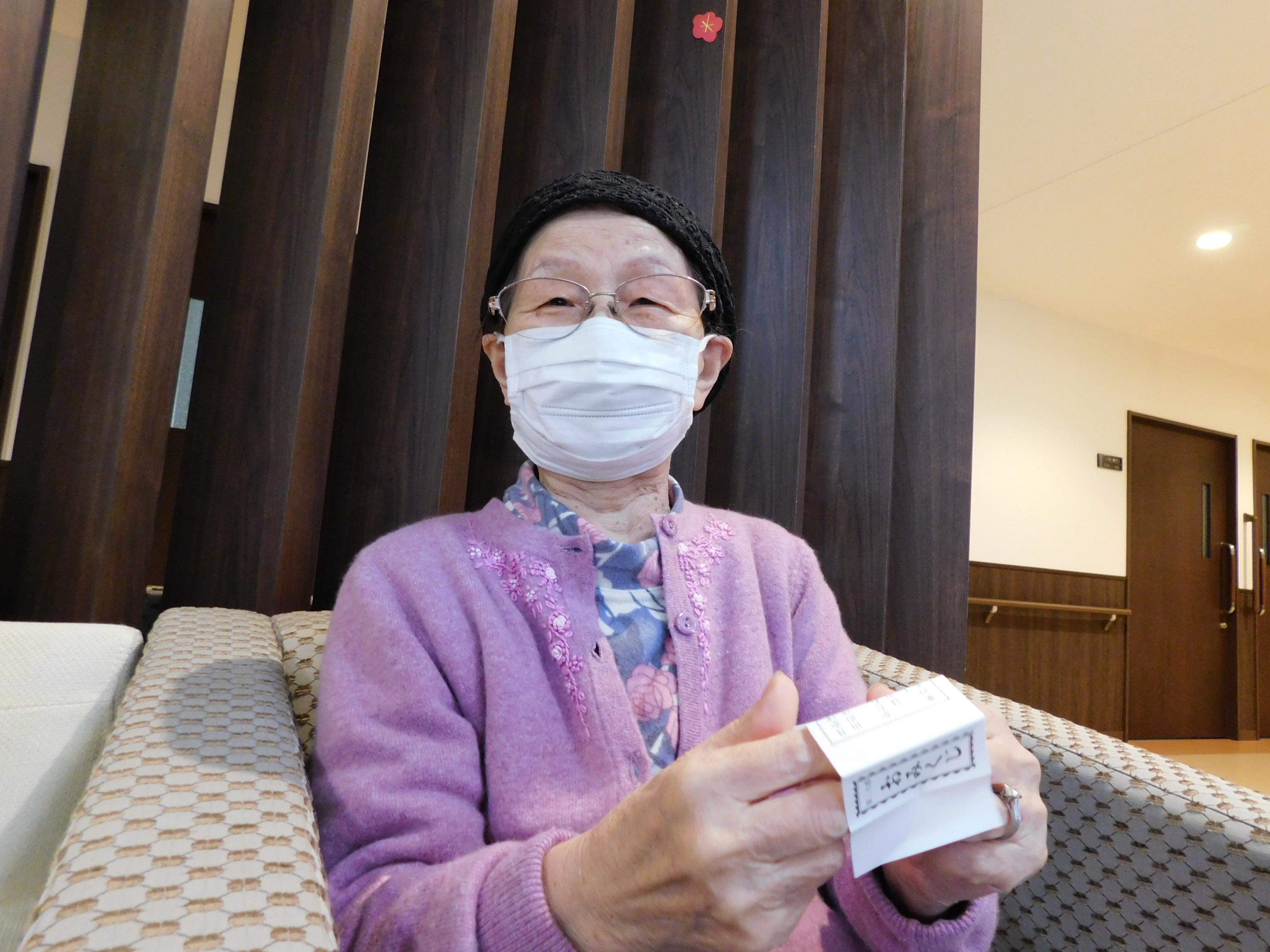 はらはらドキドキした後は「福笑い」に挑戦。「もう少し上、あとちょっと左」「このへんかしら?こっちかな?」と悩んだ末になんとか完成!目隠しを外して見てみると、なんとも個性的な顔が出来上がりました。これで今年も「福」が来ること間違いなしです!!