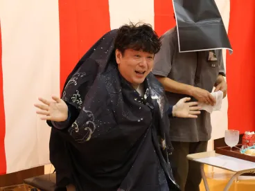 今回のメインの出し物は、施設長とスタッフによる『二人羽織』です!
