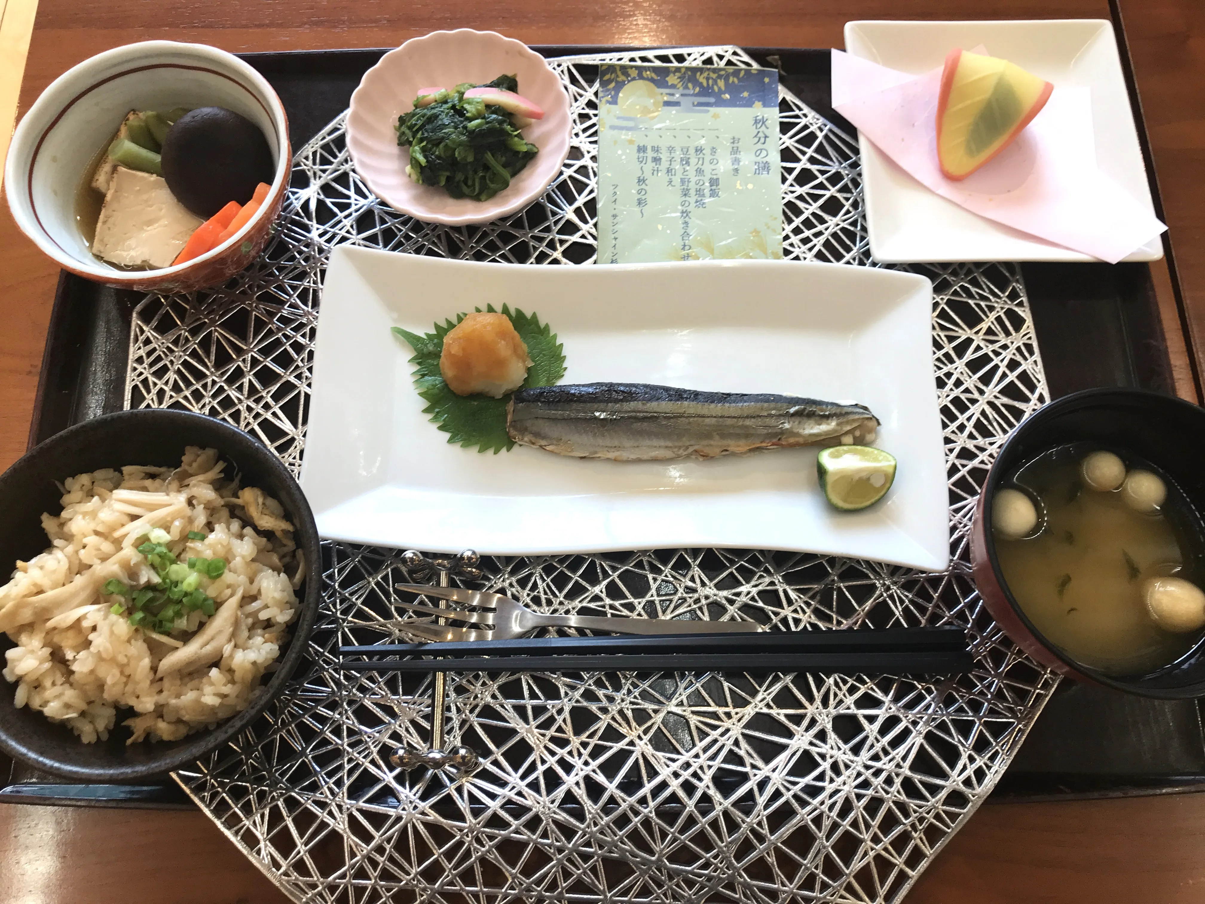 本日は秋分の日です。ランチは秋分の日特別メニューをご用意しました。本日のお品書きはきのこ御飯秋刀魚の塩焼豆腐と野菜の炊き合わせ辛子和え味噌汁練切~秋の彩~秋刀魚はそのまま召し上がって頂ける様に骨を全て取り除き、食べやすい様にご用意させて頂きました。秋の訪れを食から感じて頂ける、ランチタイムとなりました。