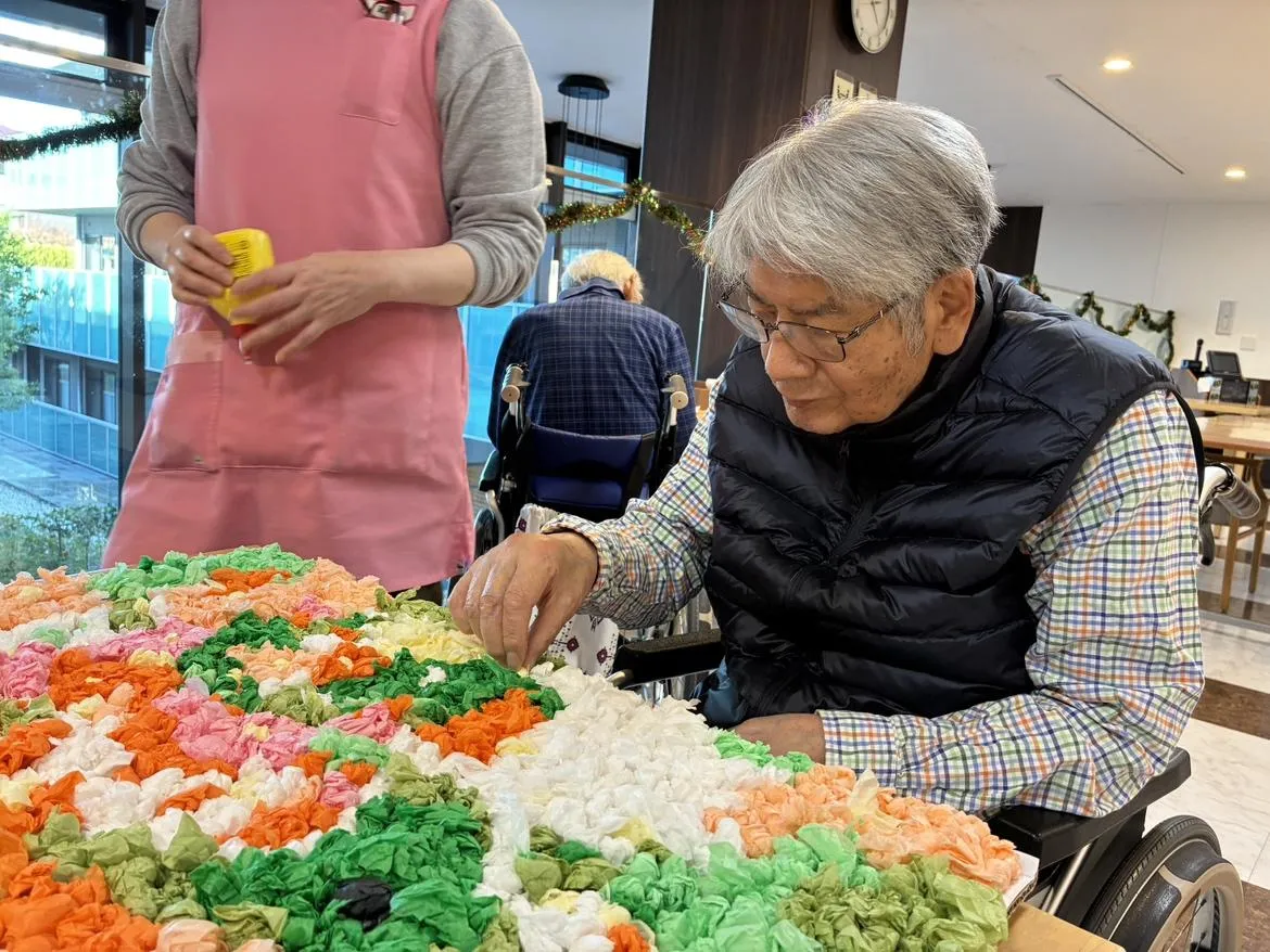 手先を使うことで集中力が高まり、完成した作品を見て皆さま笑顔に。お部屋の入口に飾って楽しまれています。