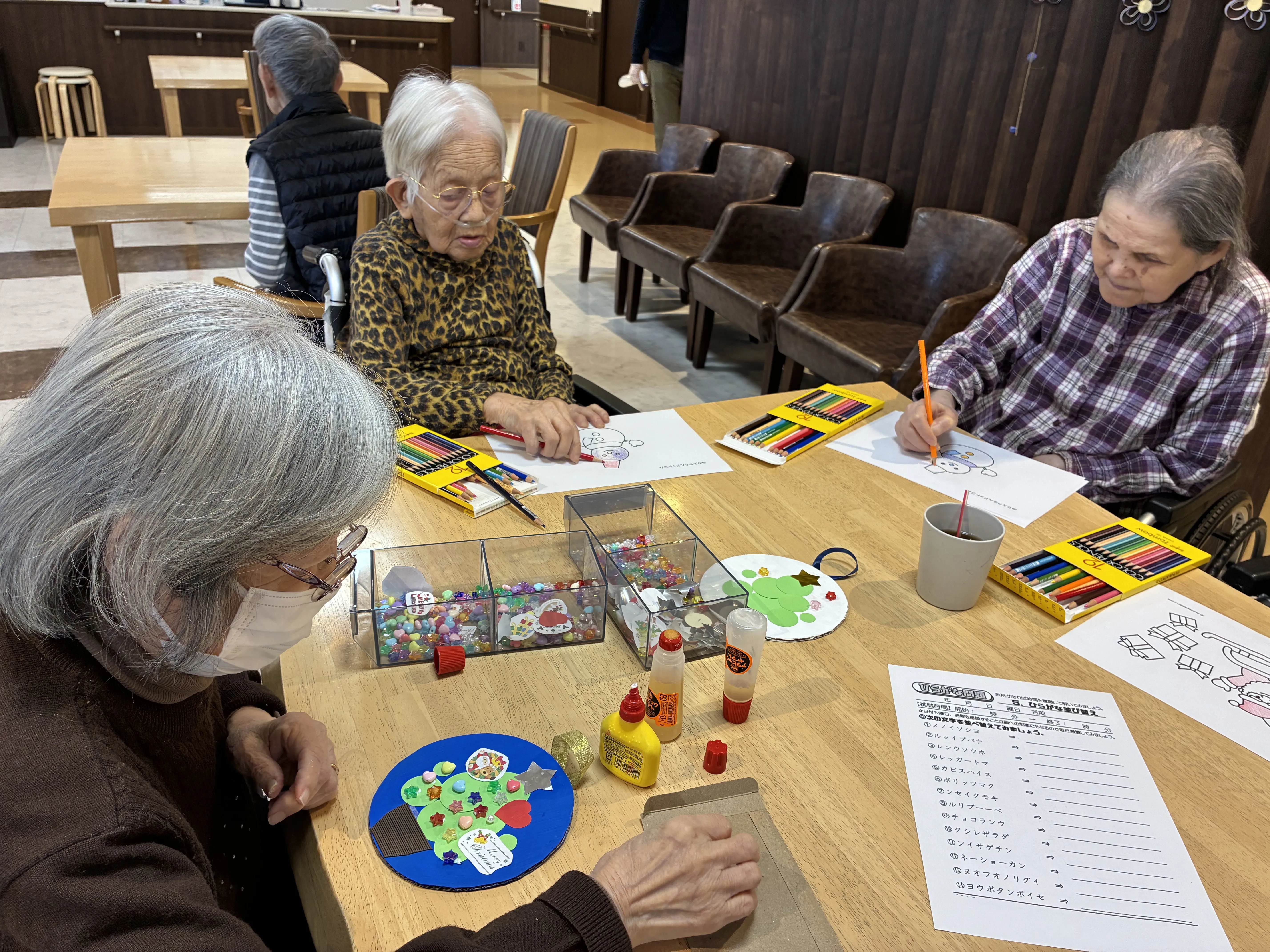 ツクイ・サンシャイン杉並では日々の生活をいきいきと過ごしていただくために、機能訓練として脳トレ・ハンドワーク・歌などを組み合わせた活動を行っております。