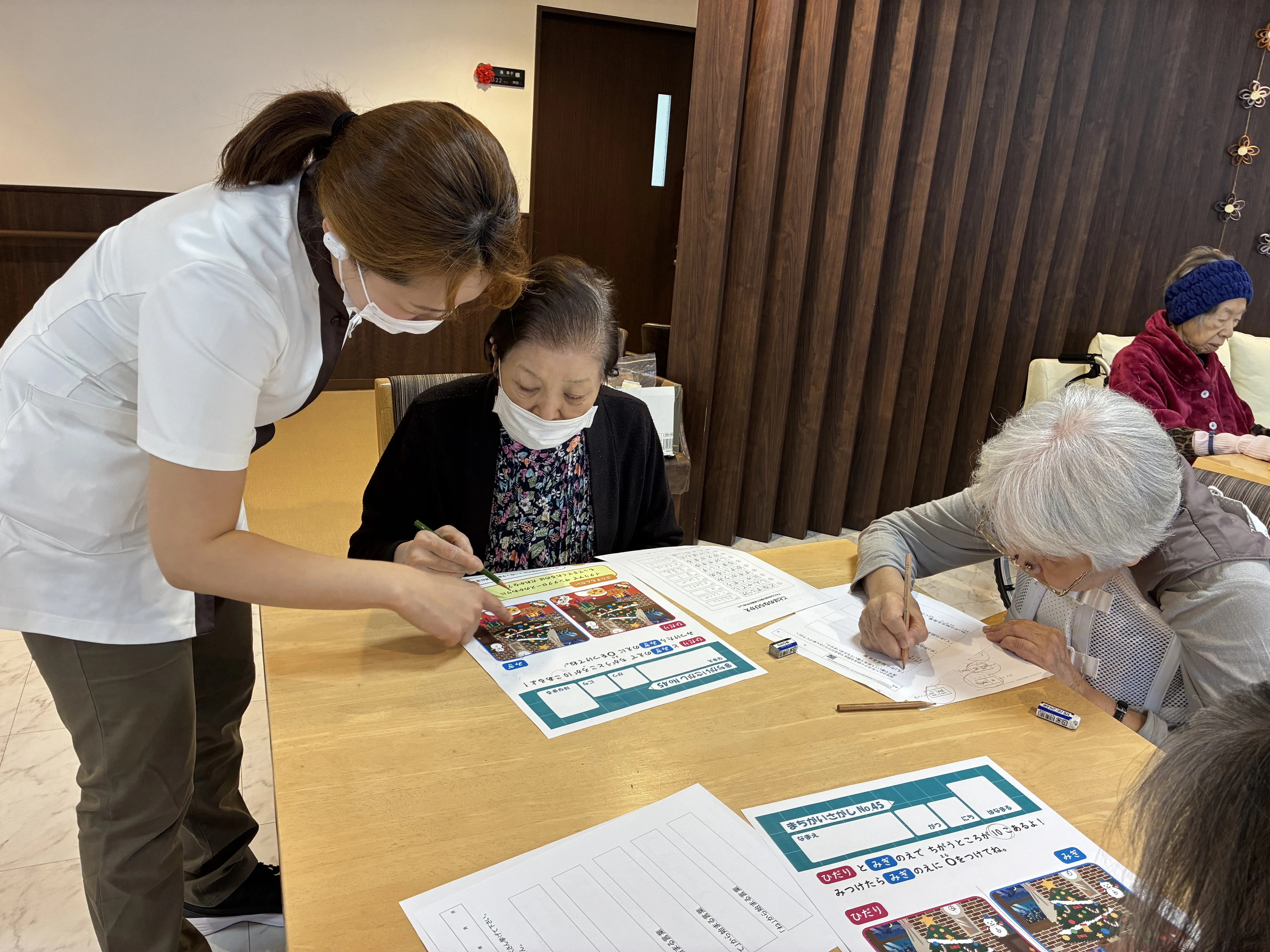 「これ難しいね!」「昔は得意だったのよ」と会話も弾み、楽しみながら脳を刺激する時間となっています。