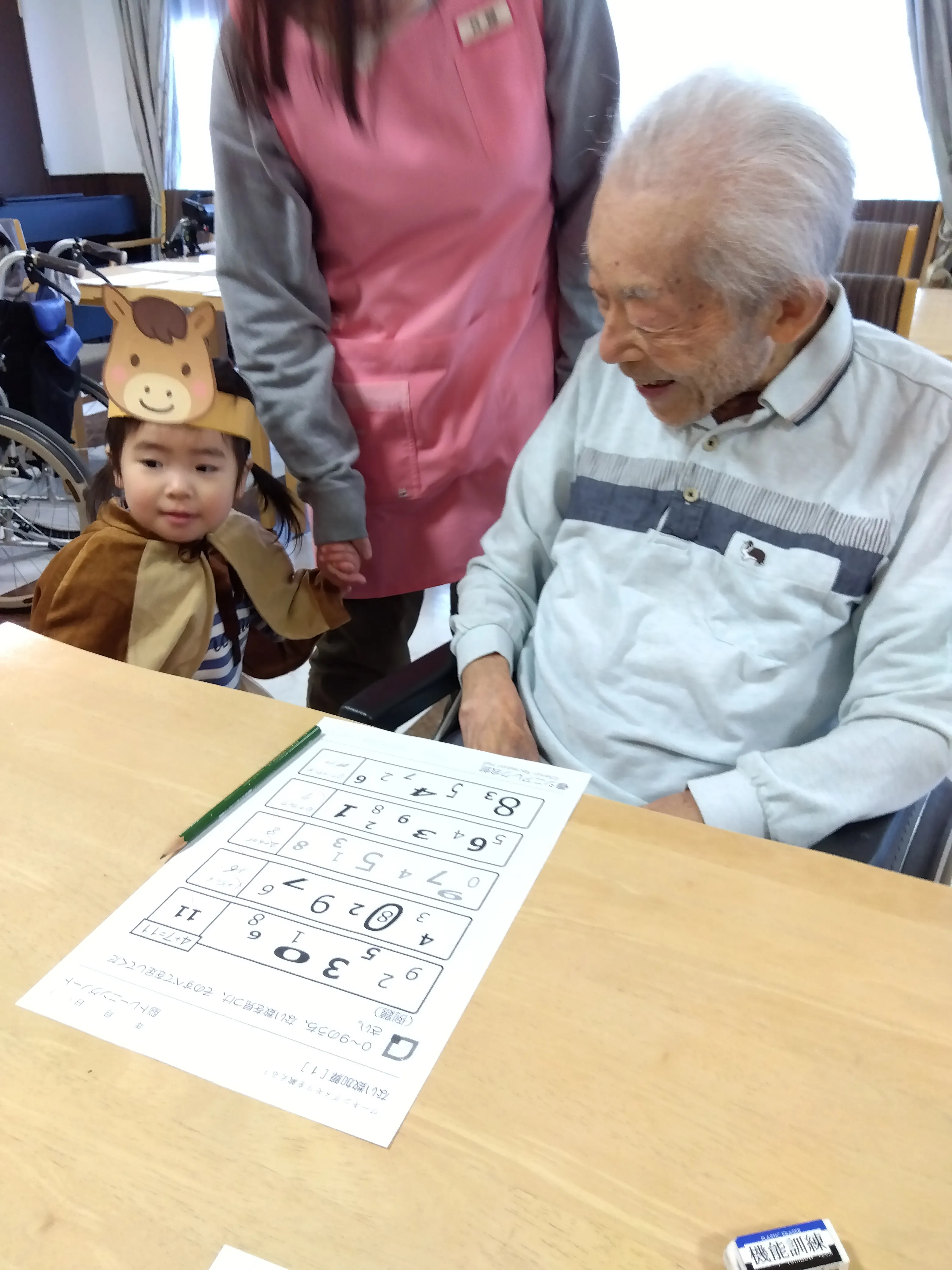 この日はお正月をテーマにした交流会です。今年の干支”午”の仮装をして遊びに来てくれました!かわいらしい姿に、お客様も自然と笑顔になります。
