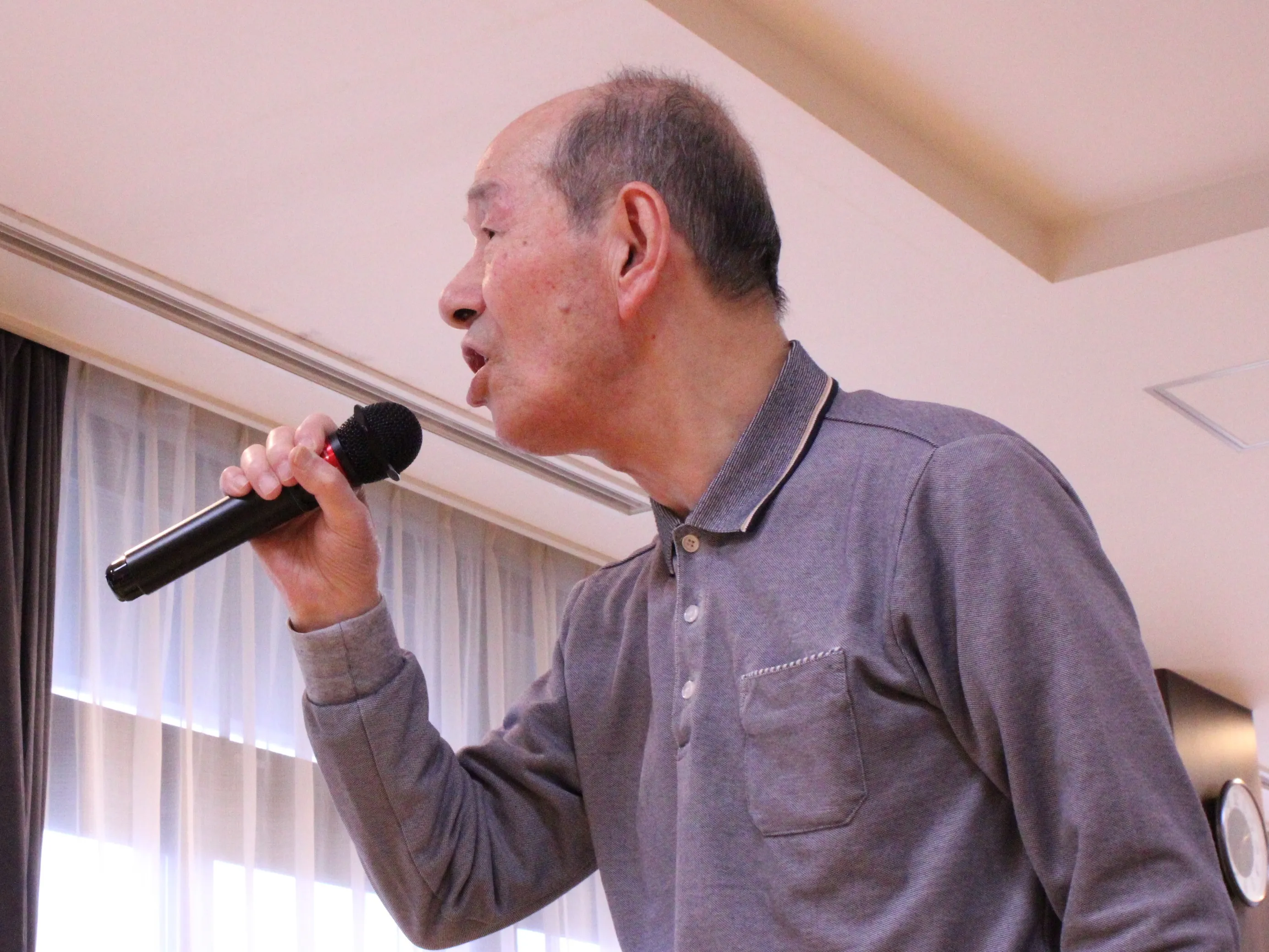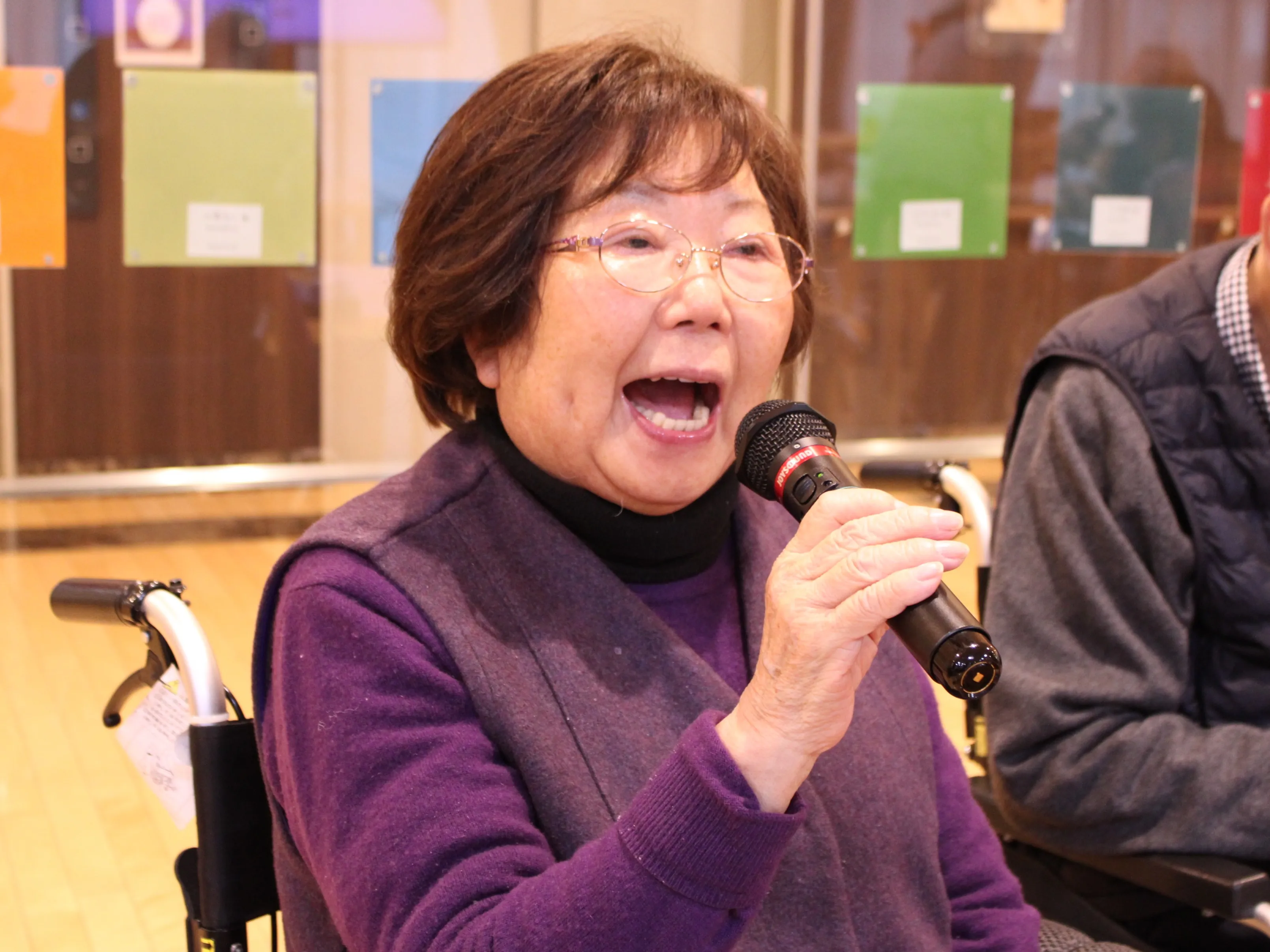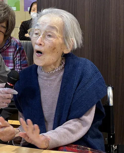 最初は「聞くだけでいいわ」と仰っていたお客様も、他のお客様の歌を聴いて一緒に口ずさむうちに緊張がほぐれたのか、カラオケに参加していただき、とても楽しまれていました。