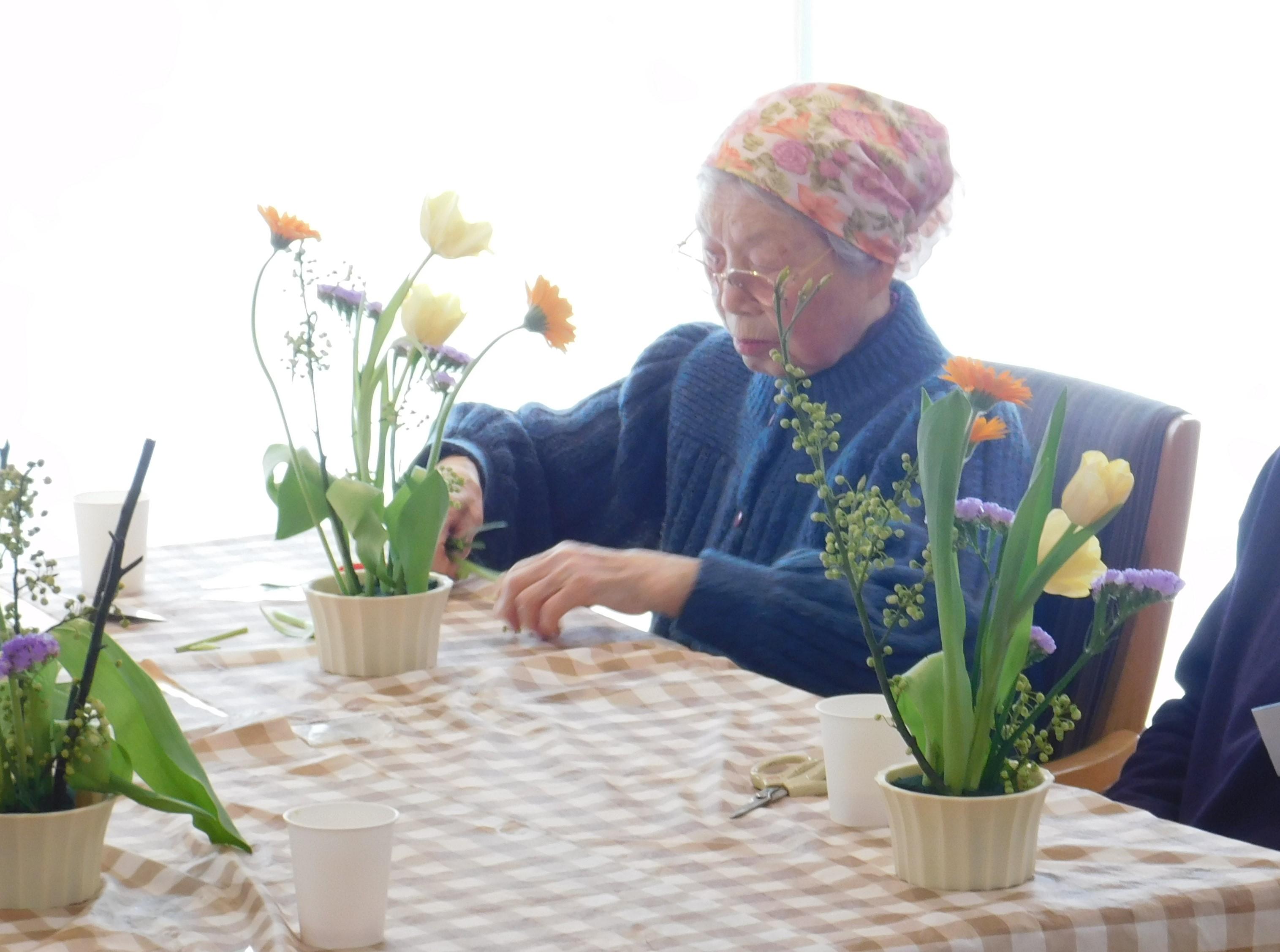 今月の花と緑の教室では、チューリップ、スターチス、ガーベラ、青もじをアレンジメントしていただきました。青もじの花言葉は、一つの枝にたくさんの花を咲かせることから、‟友人が多い“と言われています。お客様同士、レクリエーションの場で顔を合わせ仲良くなることが多々見られます。これからもレクリエーションの場が、皆様の交流のかけ橋になっていければと思っております。