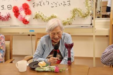 今月のお誕生日ケーキは、おしゃれなショートケーキでした。スポンジは厨房で手作りし、いわゆるショートケーキとは見た目が違い、お上品な飾りに皆様喜ばれていました。