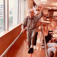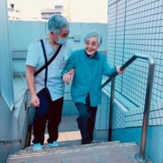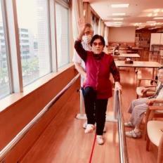 少し新型コロナウイルス感染症が落ち着きつつある今、施設の中庭で5月の風を肌で感じながら、いつ屋外へ出向いても足がすくまないように、歩行訓練や階段昇降訓練を行っています。