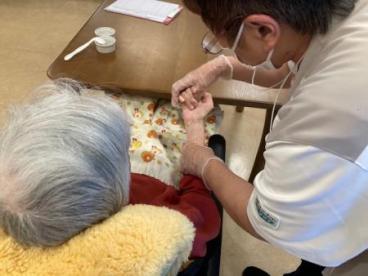ケアの合間に指導を行い、介護スタッフも積極的に実施していきます。