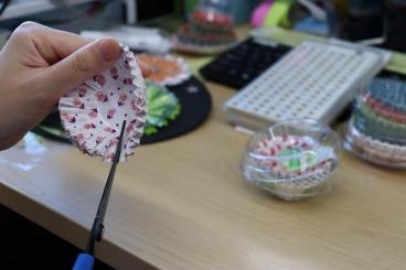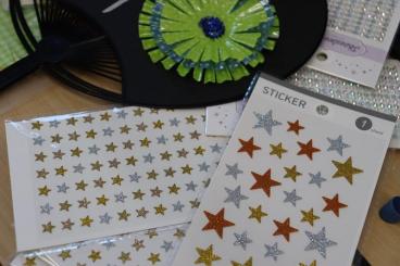 色や大きさを組み合わせて、黒いうちわに貼ります。