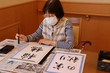 書き終えた文字を見返しながら、「何度書いても同じね」といまひとつの表情。