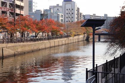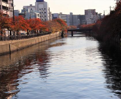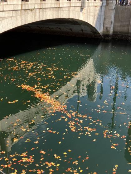 この時期は、川沿いに並ぶ桜の木が見事に紅葉していて、とても綺麗です。
