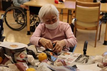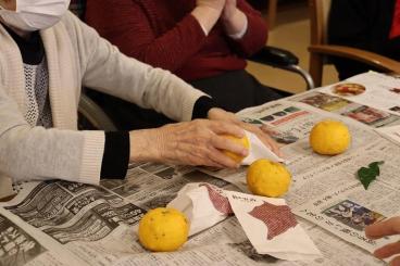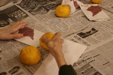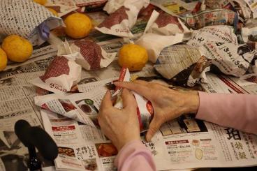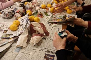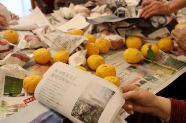 ゆずを一つずつ紙に包む作業。皆様に手伝っていただきました。