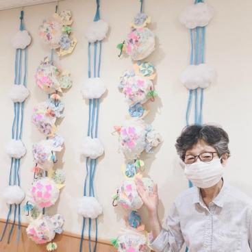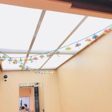 エレベーター内には小さな傘を飾り、正面玄関には梅雨をイメージ作品を展示しています。