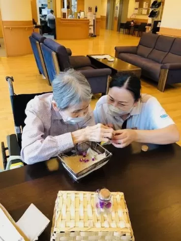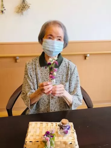 【+αの訓練】の”いきものがかり”で屋上で育てたお花をドライフラワーにし、瓶詰めや壁掛けをつくりました。